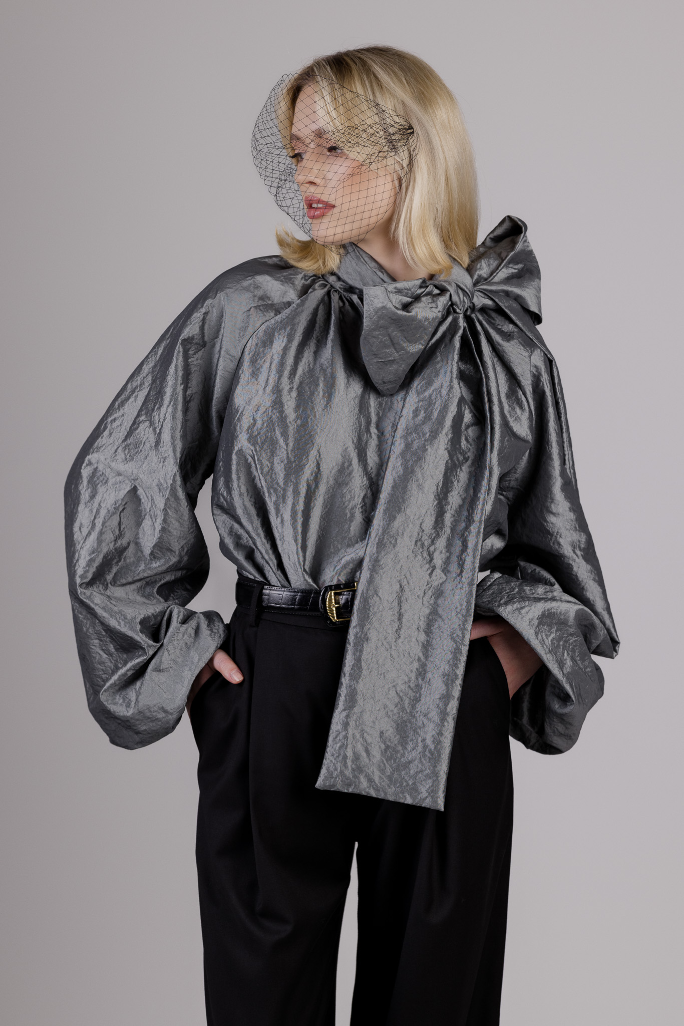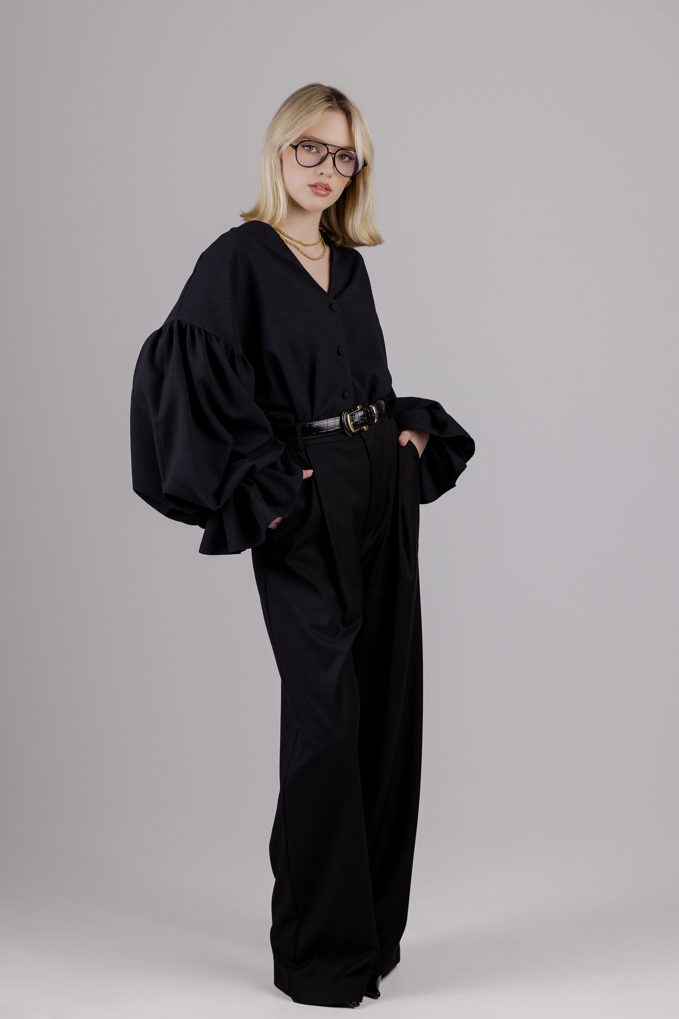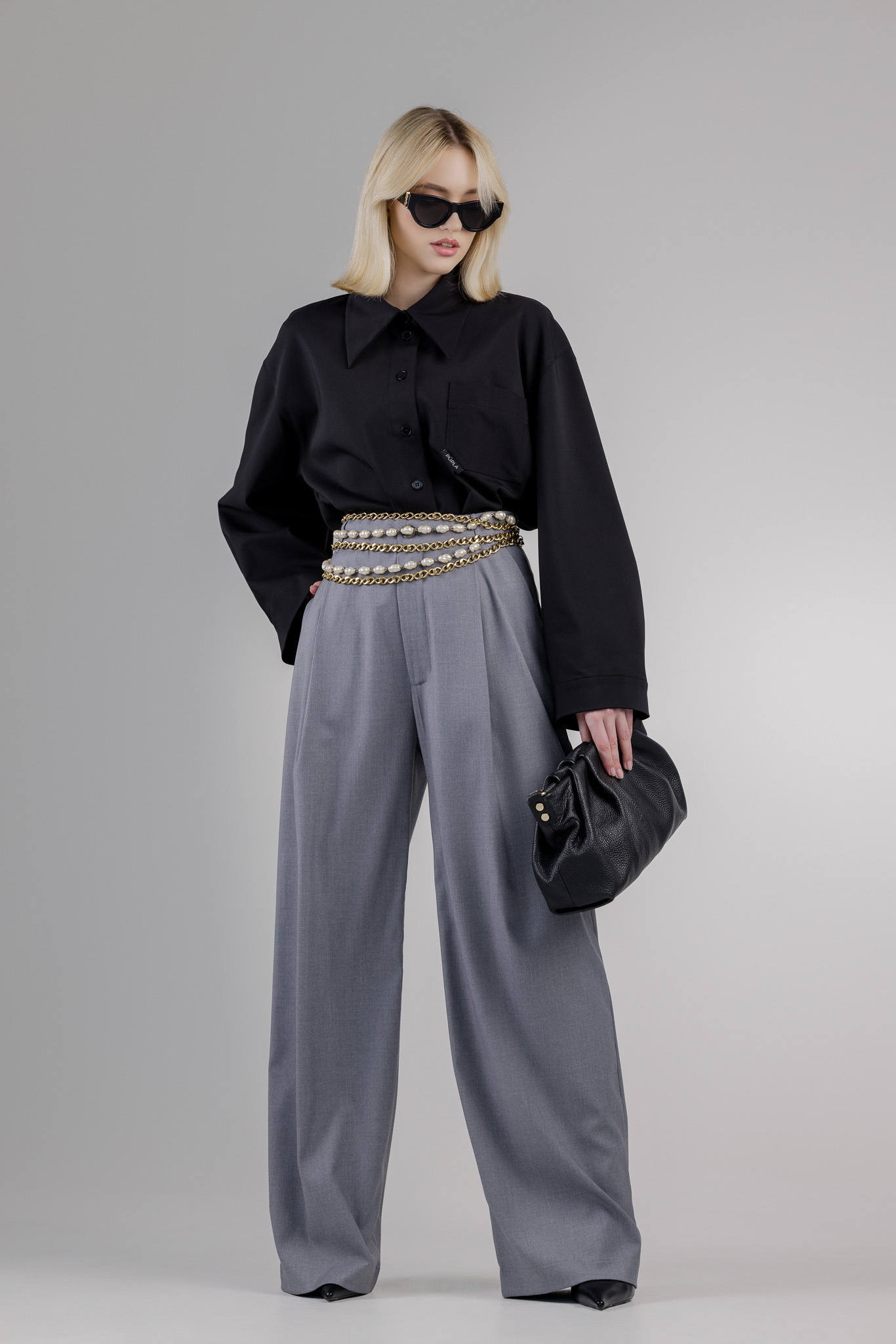 Išraiškingi marškinių pečiai ir griežta apykaklė sukuria monumentalią liniją, kuri nėra tik detalė, o viso įvaizdžio ašis 🫷