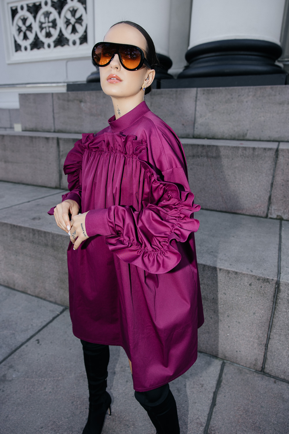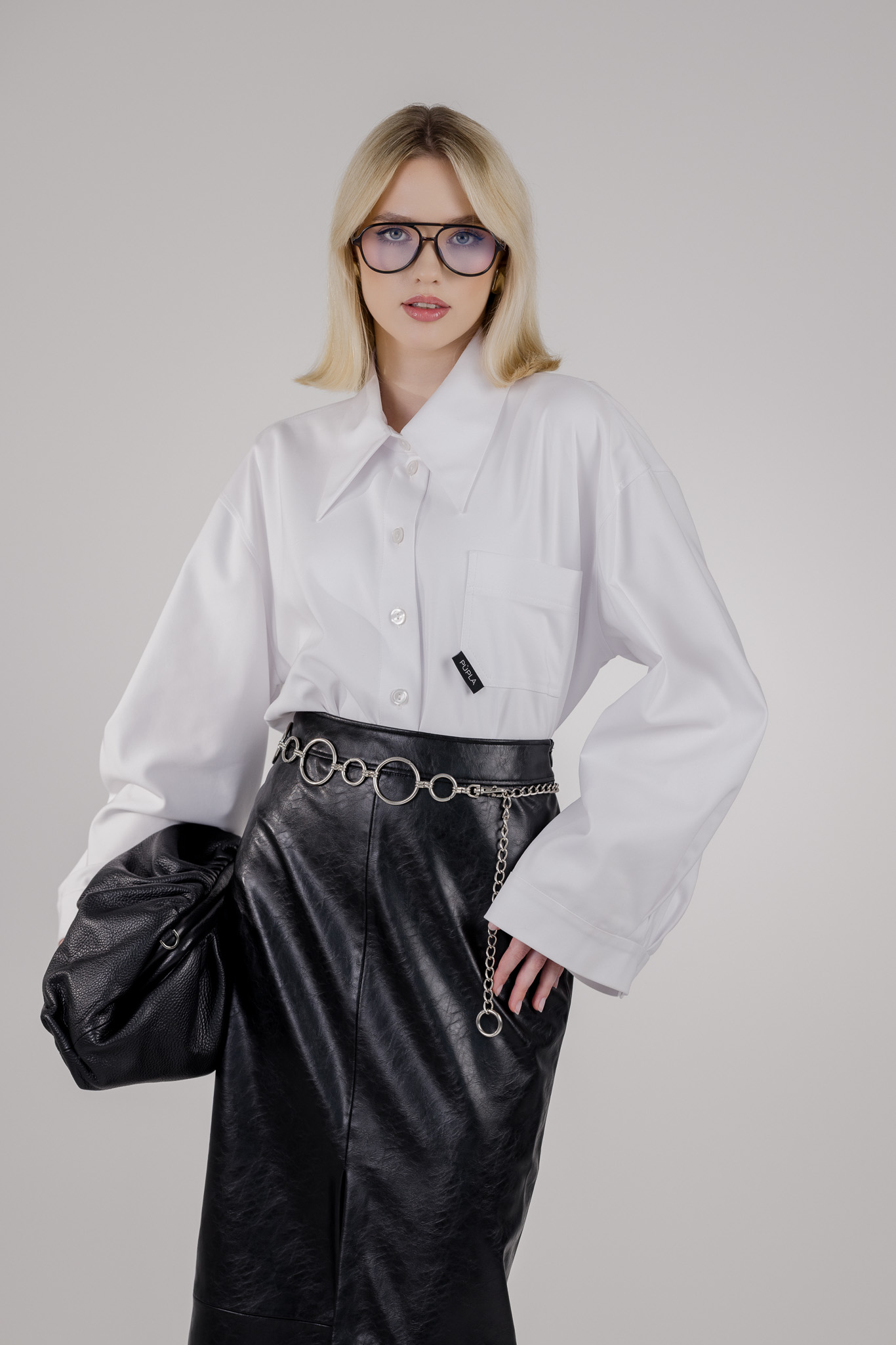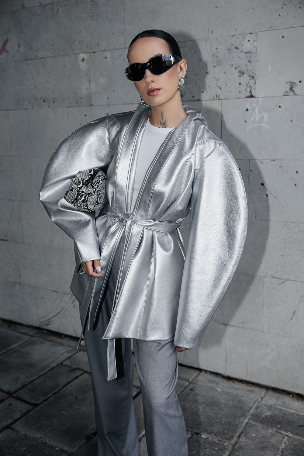 Išraiškingi marškinių pečiai ir griežta apykaklė sukuria monumentalią liniją, kuri nėra tik detalė, o viso įvaizdžio ašis 🫷