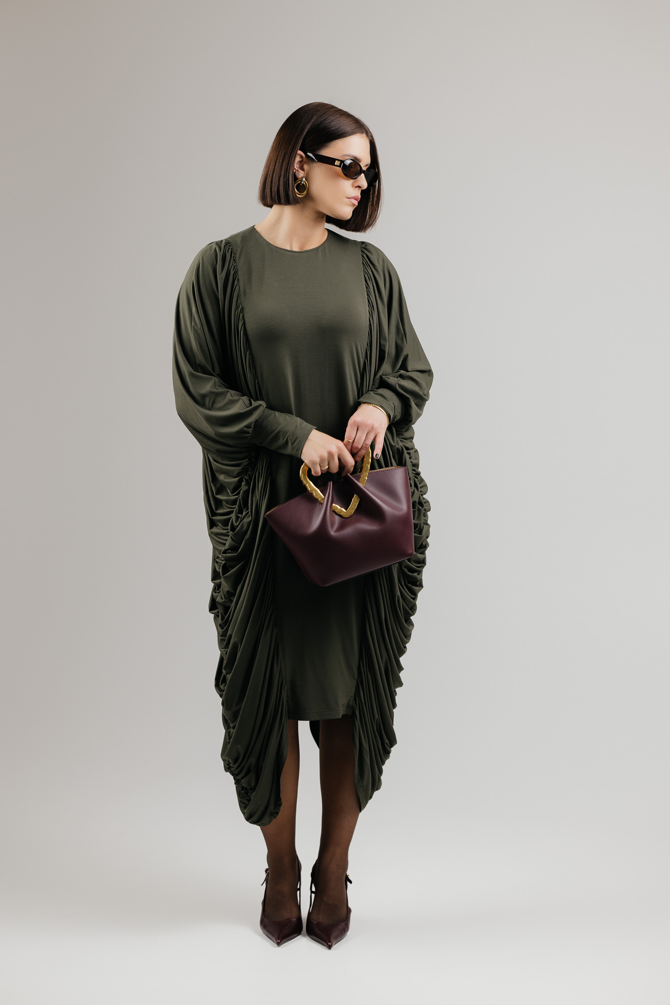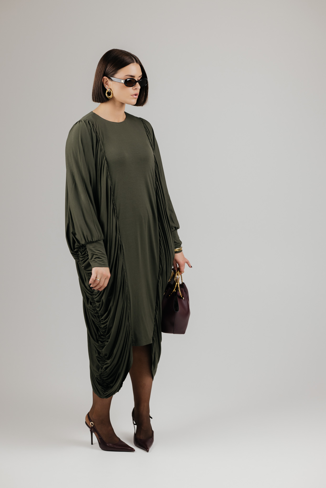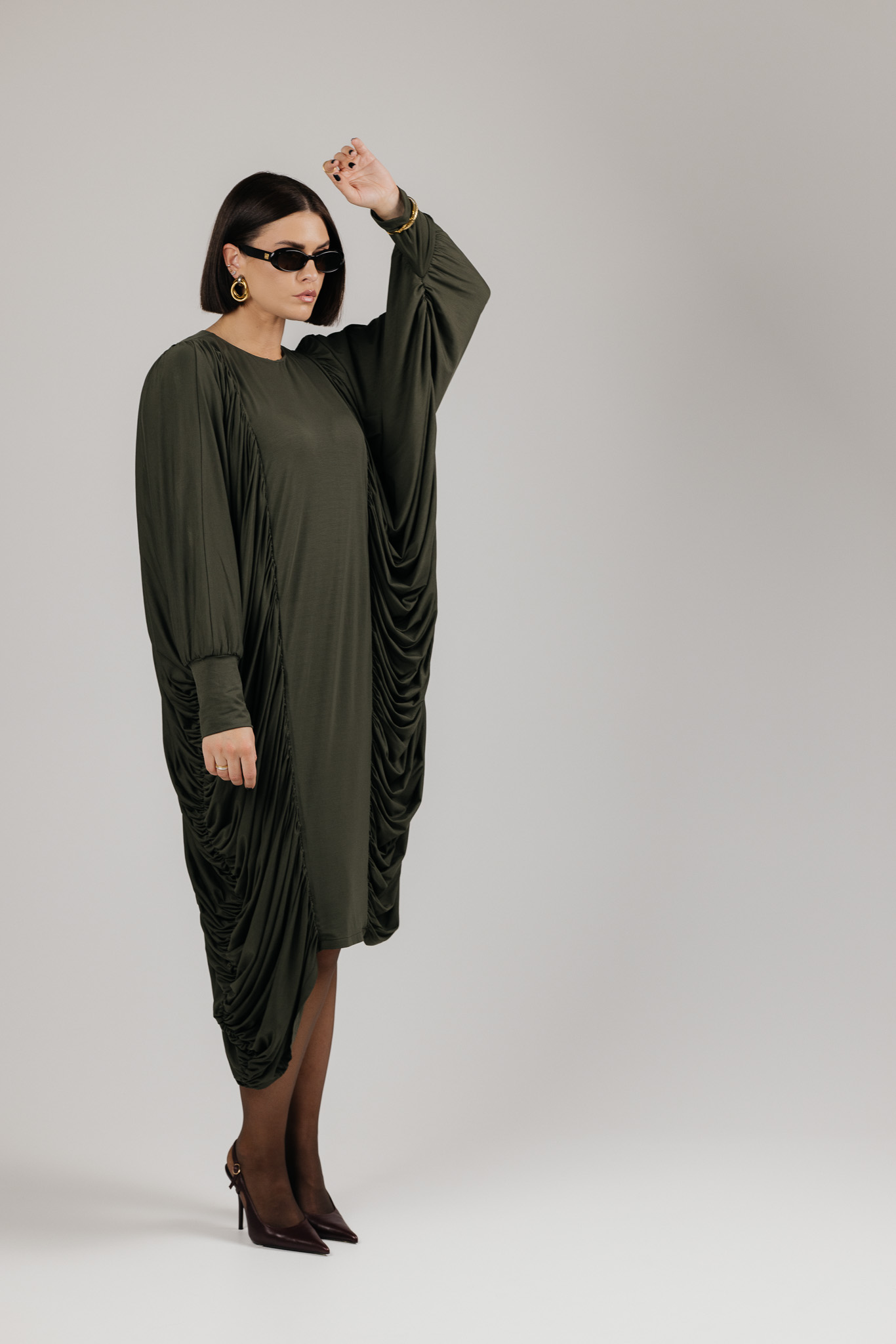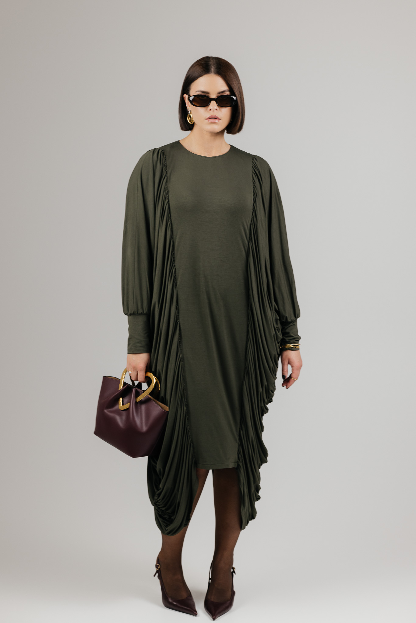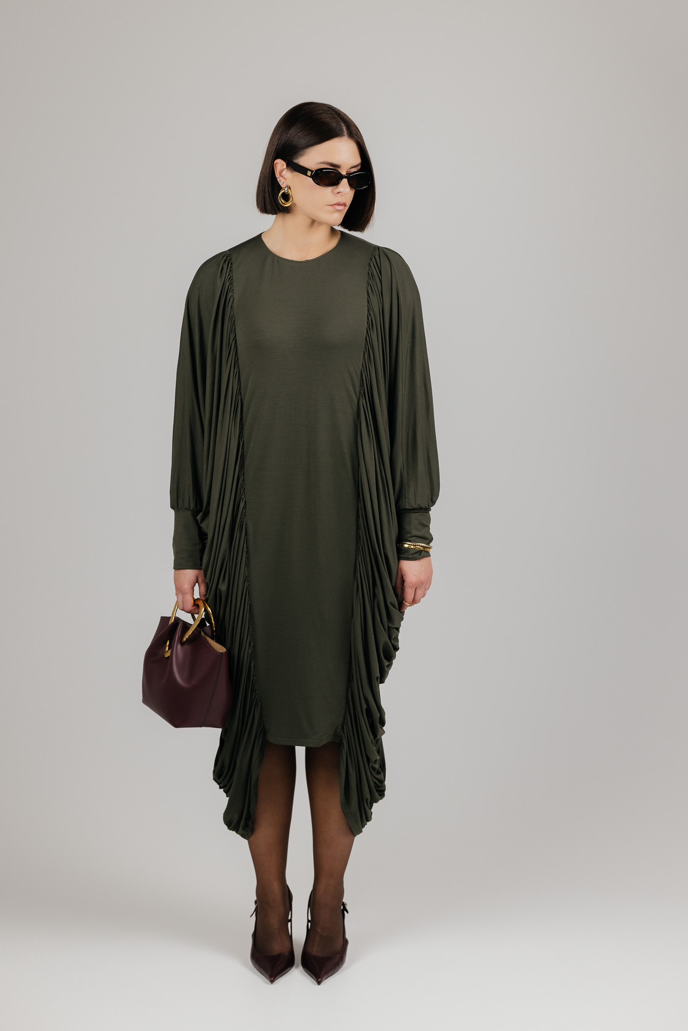 DRAPE suknelė sukurta iš medžiagos, kuri krenta laisvai ir natūraliai, formuodama minkštas, banguojančias klostes. Drapiruotos šoninės linijos sukuria skulptūrišką siluetą, o kiekvienas judesys suteikia suknelei gyvumo ir lengvumo.