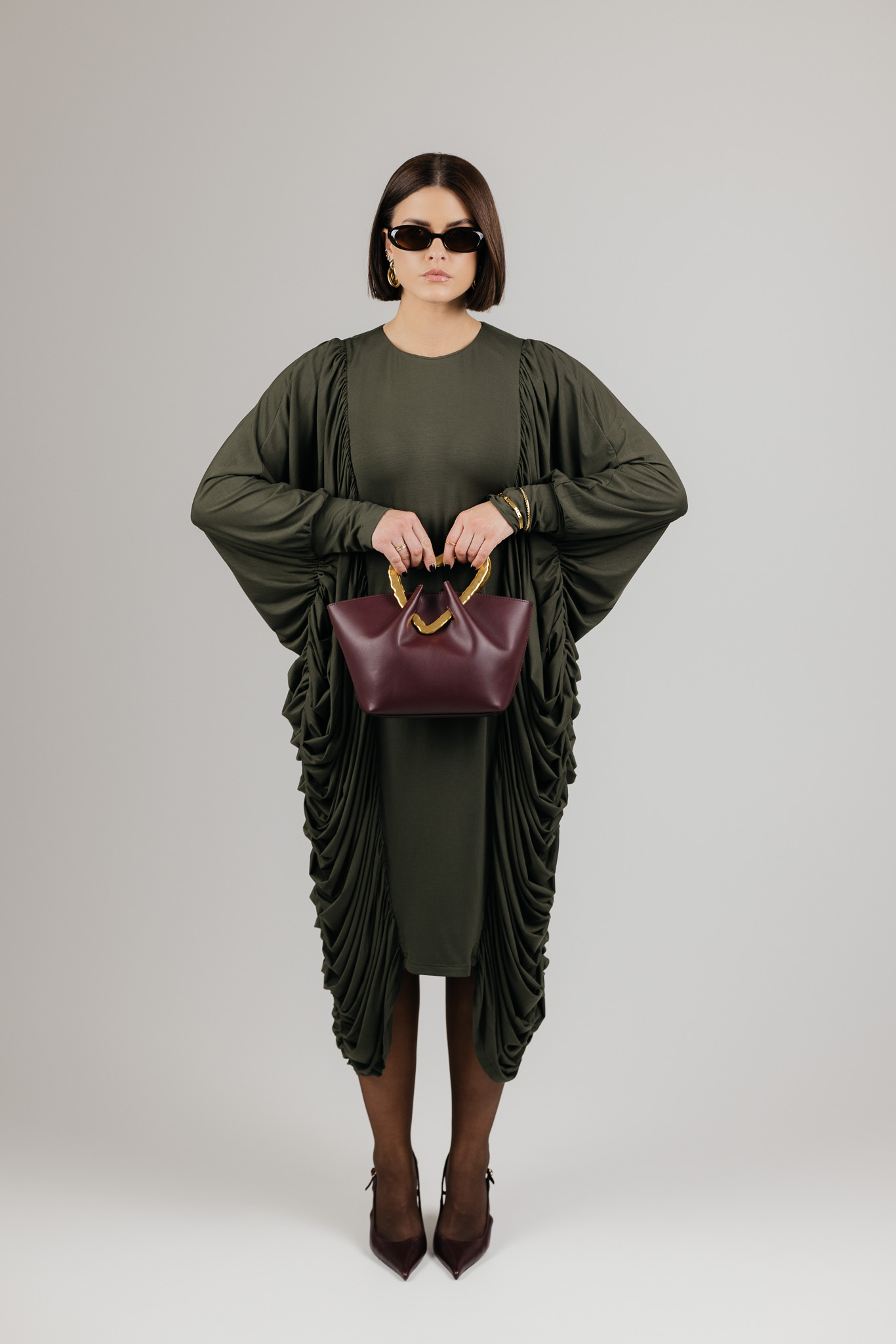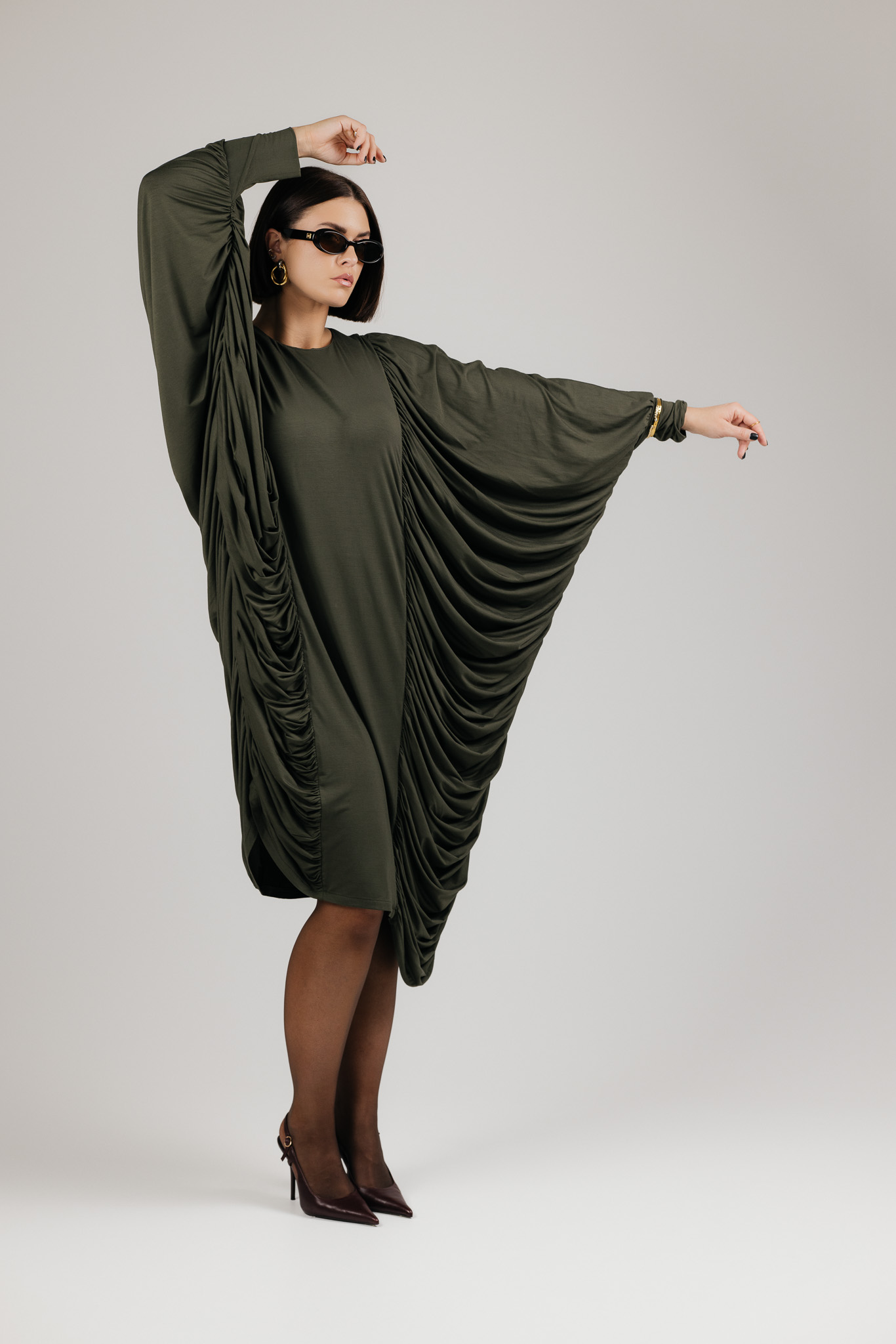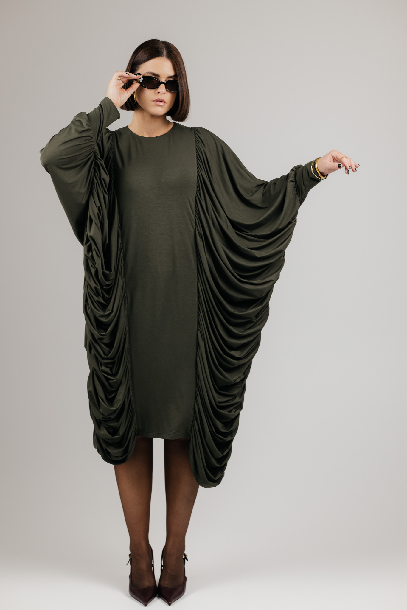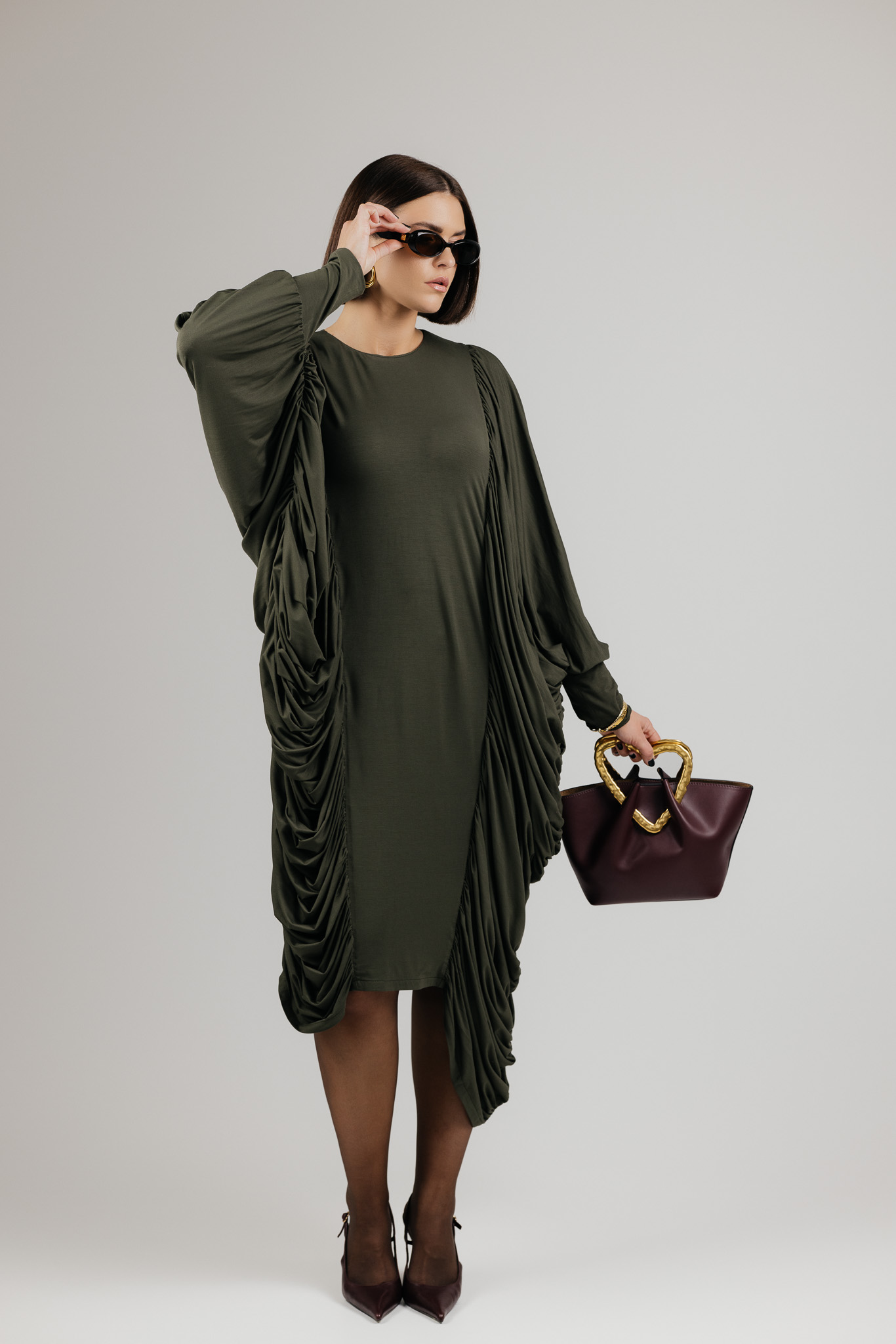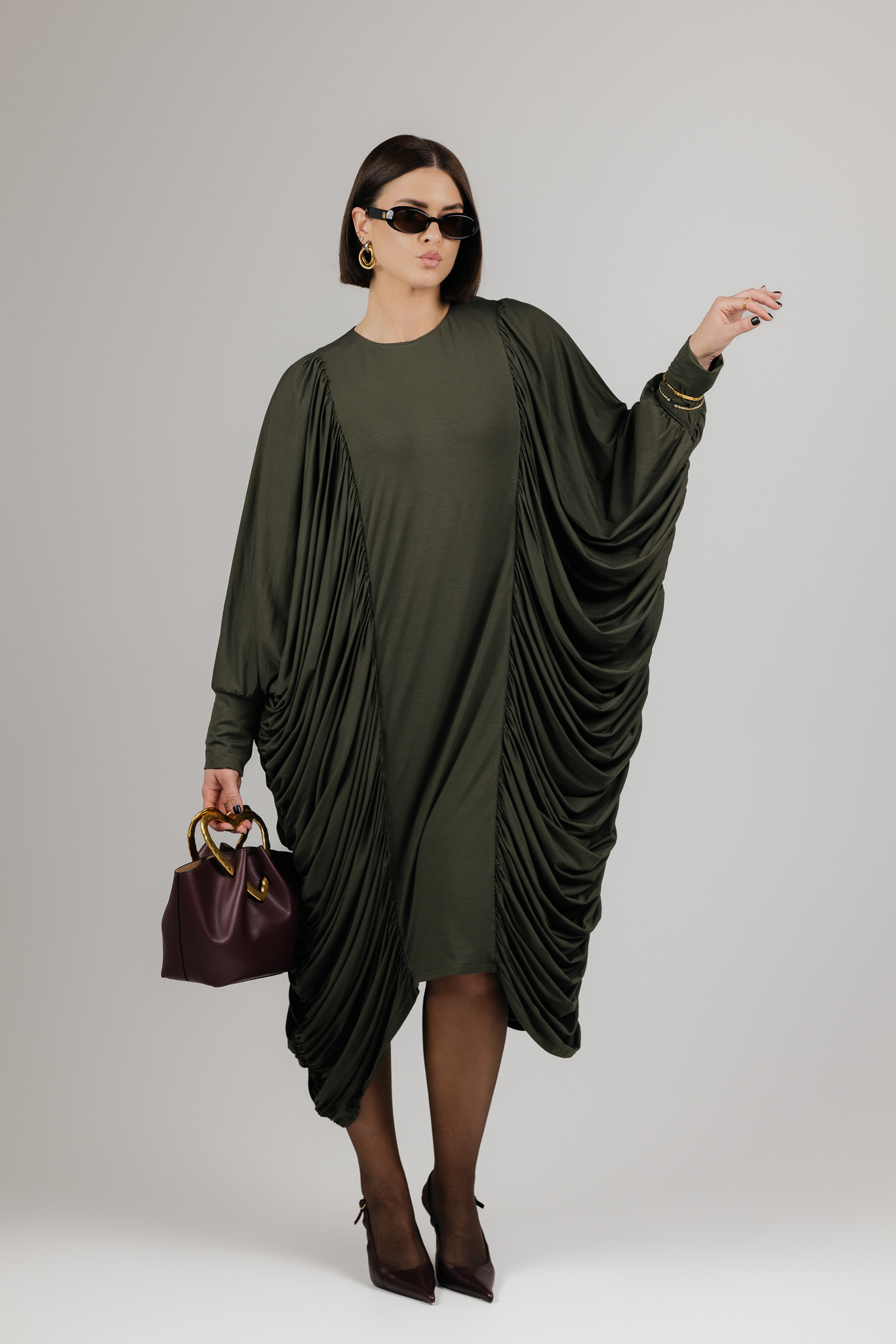 DRAPE suknelė sukurta iš medžiagos, kuri krenta laisvai ir natūraliai, formuodama minkštas, banguojančias klostes. Drapiruotos šoninės linijos sukuria skulptūrišką siluetą, o kiekvienas judesys suteikia suknelei gyvumo ir lengvumo.
