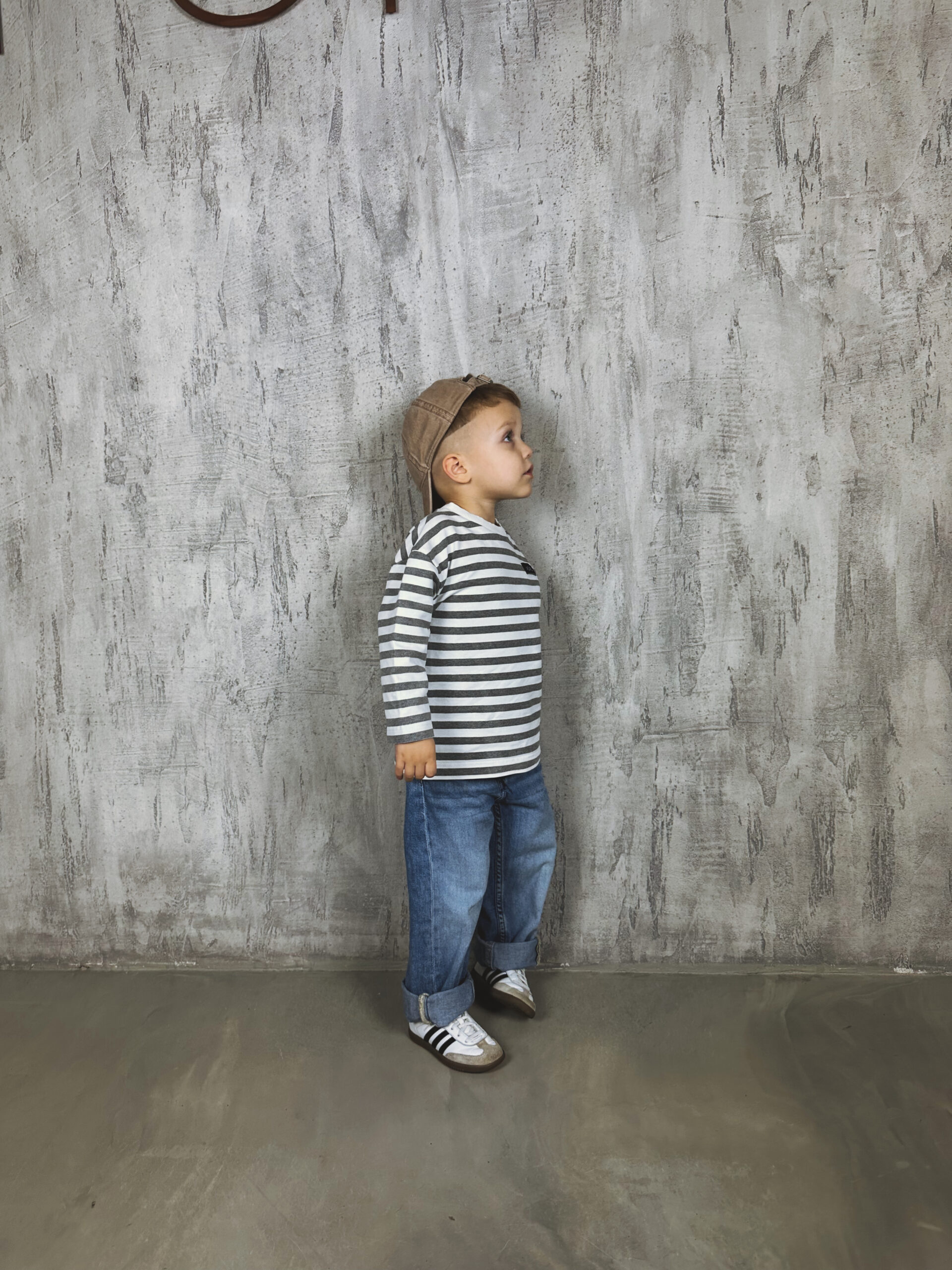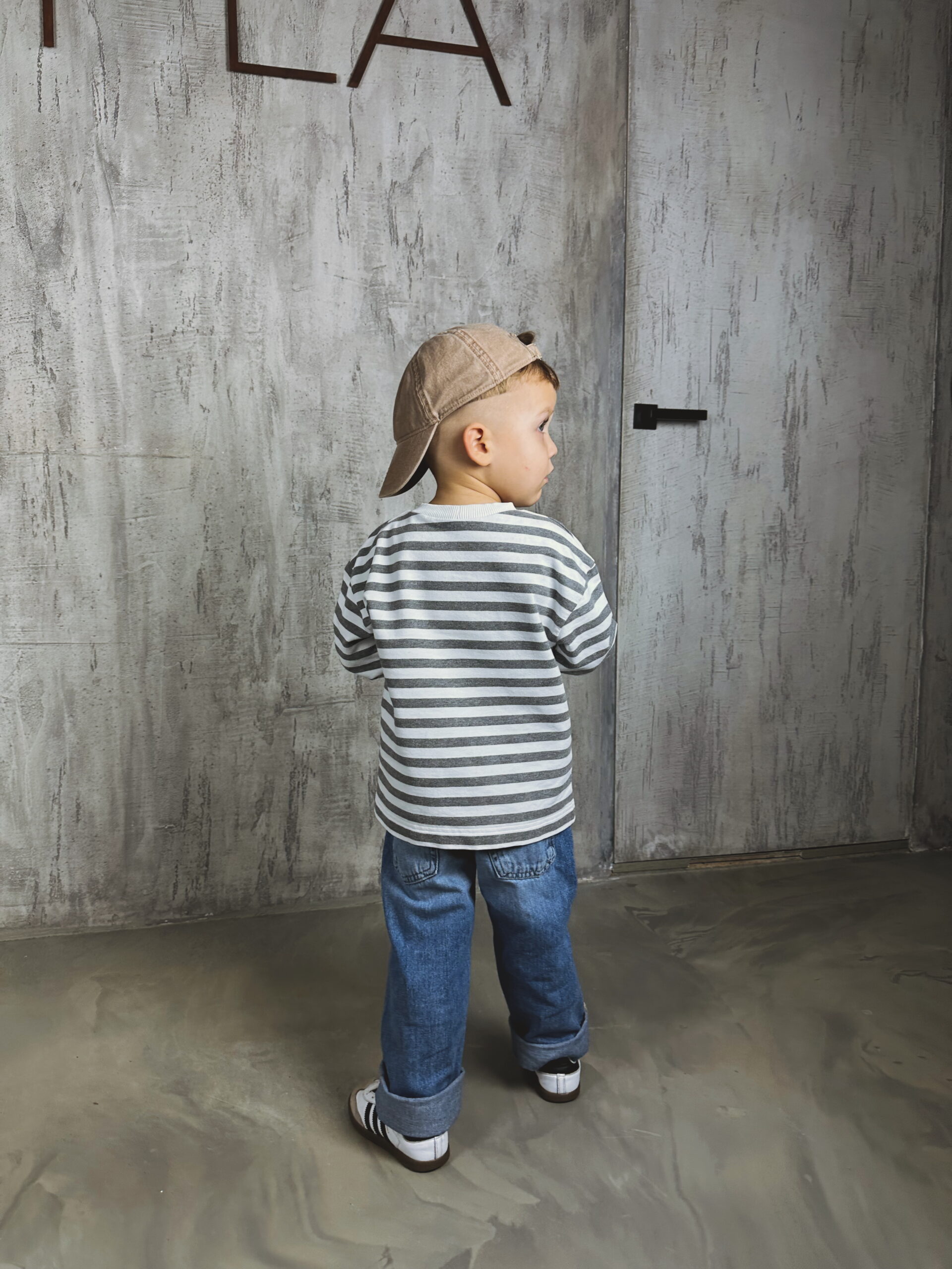 Modelis yra 97 cm ūgio ir sveria 16 kg. Nuotraukose vilkimas 98 dydžio džemperis. Rekomenduojame rinktis dydį pagal esamą vaiko ūgį – šis modelis natūraliai turi laisvą, patogų siluetą, todėl nereikia imti didesnio dydžio, kad atrodytų oversize.
