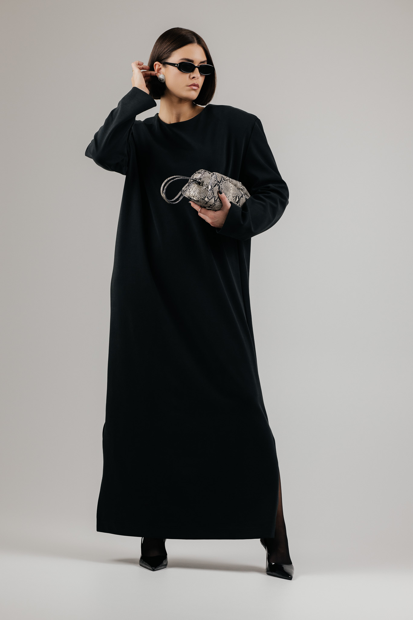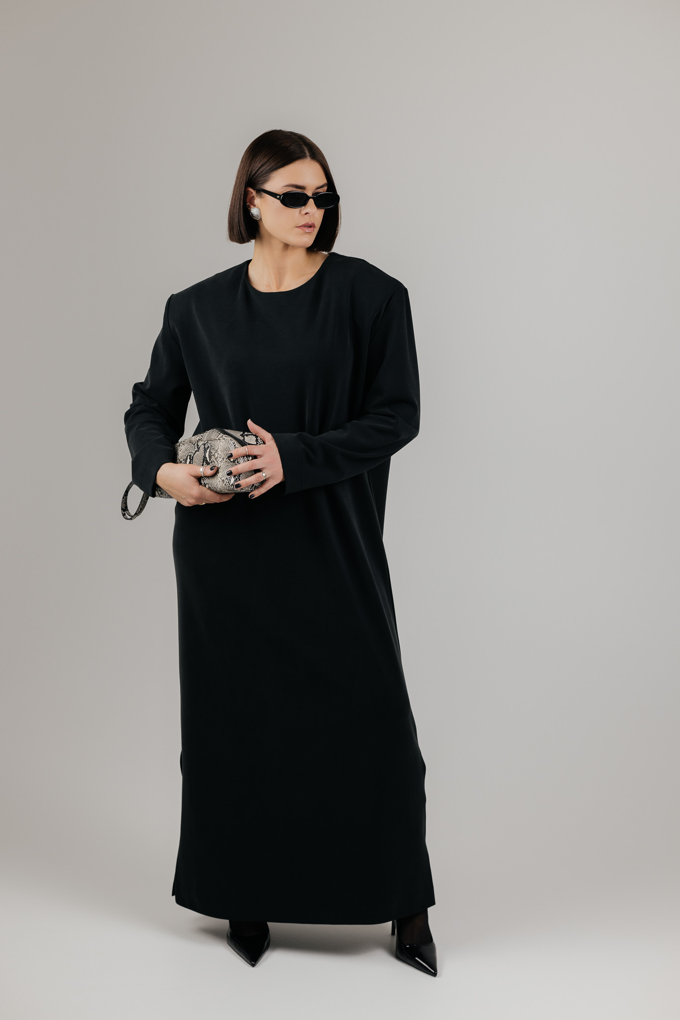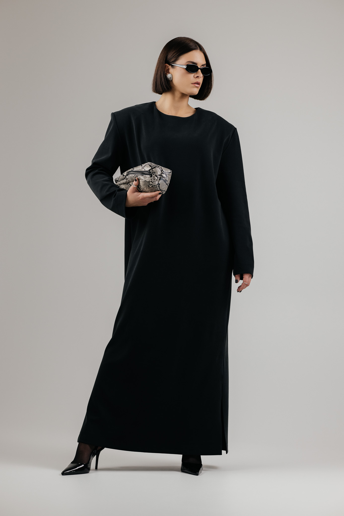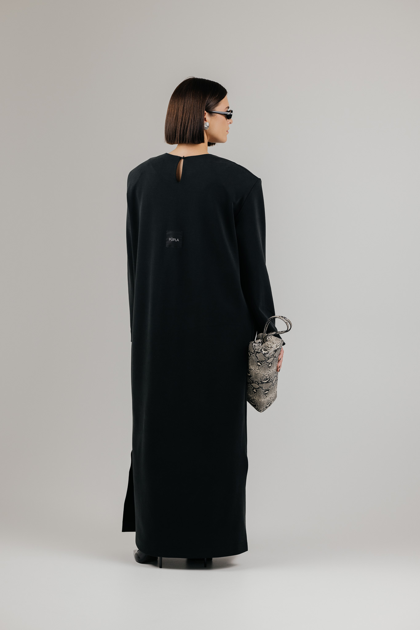 Subtilūs šoniniai skeltukai leidžia audiniui lengvai judėti kartu su kūnu, suteikdami suknelei lengvumo ir laisvės pojūtį. Tai modelis, kuriame minimalizmas tampa stipriausia detale – jokių perteklinių elementų, tik aiški forma ir nepriekaištinga proporcija.