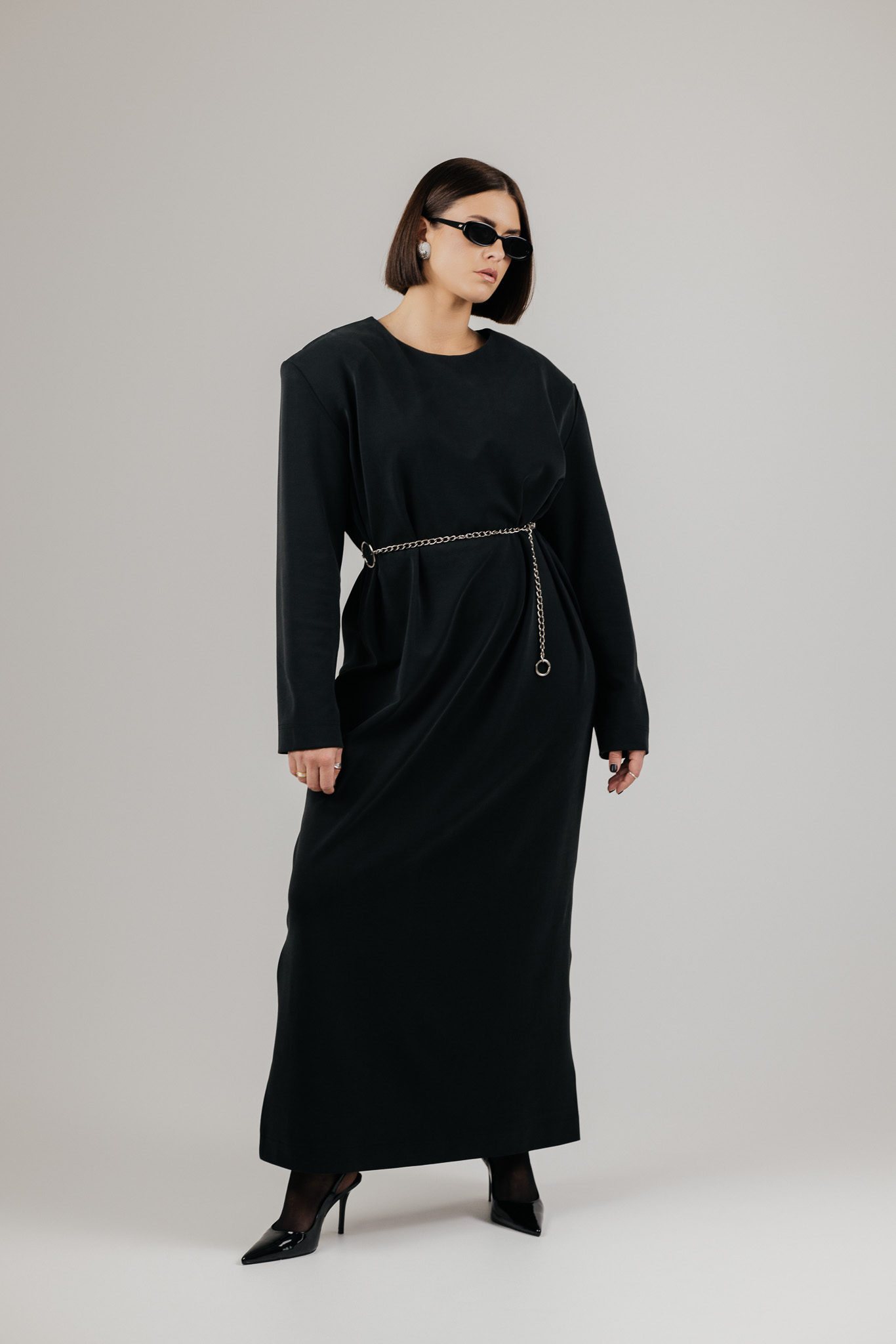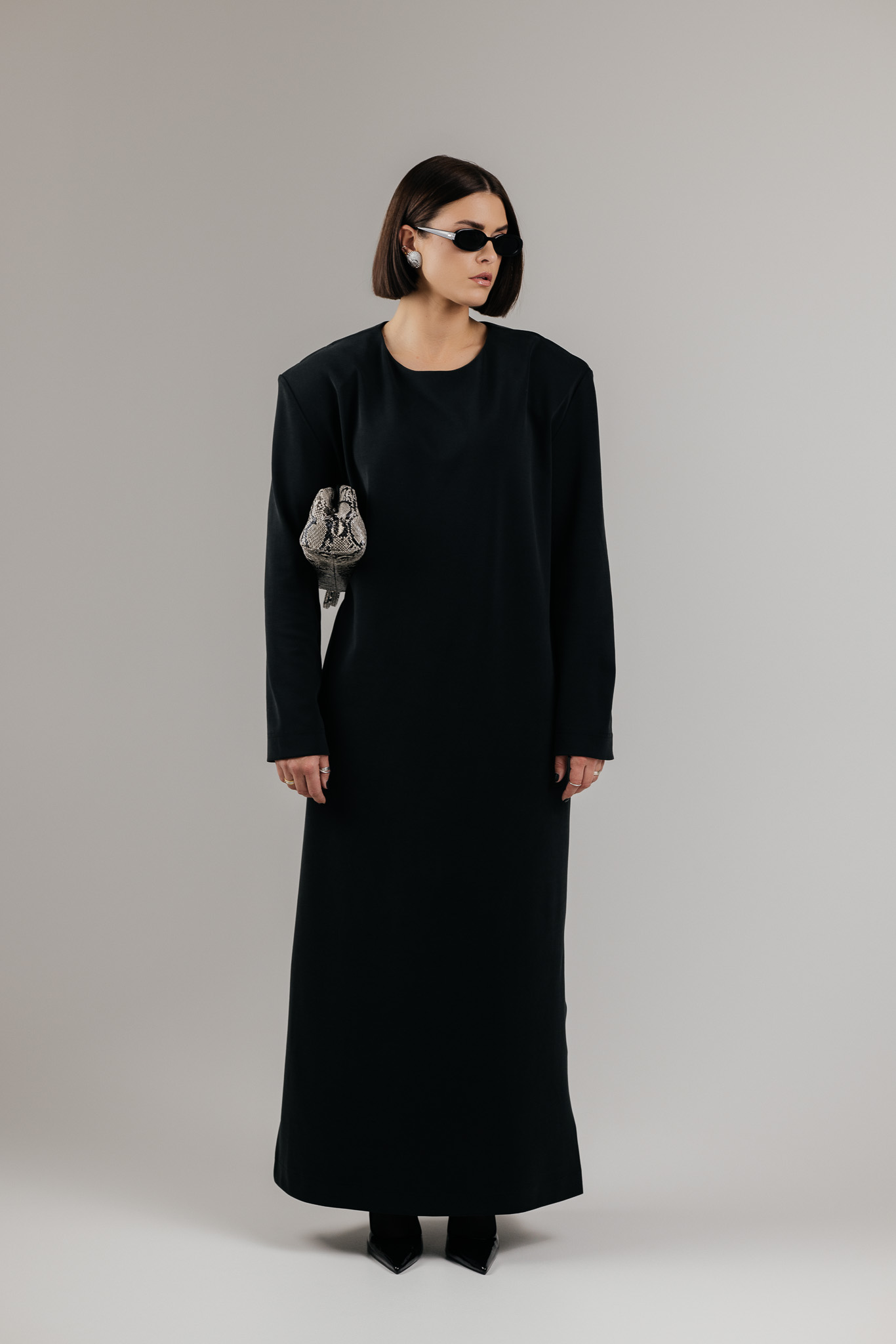 COLUMN suknelė sukurta iš švaraus, vertikalaus silueto, kuris elegantiškai seka kūno liniją ir kuria išgrynintą, architektūrišką įvaizdį. Pabrėžta pečių linija suteikia struktūros, o ilgas, tiesus kritimas išlaiko ramų ir užtikrintą charakterį.