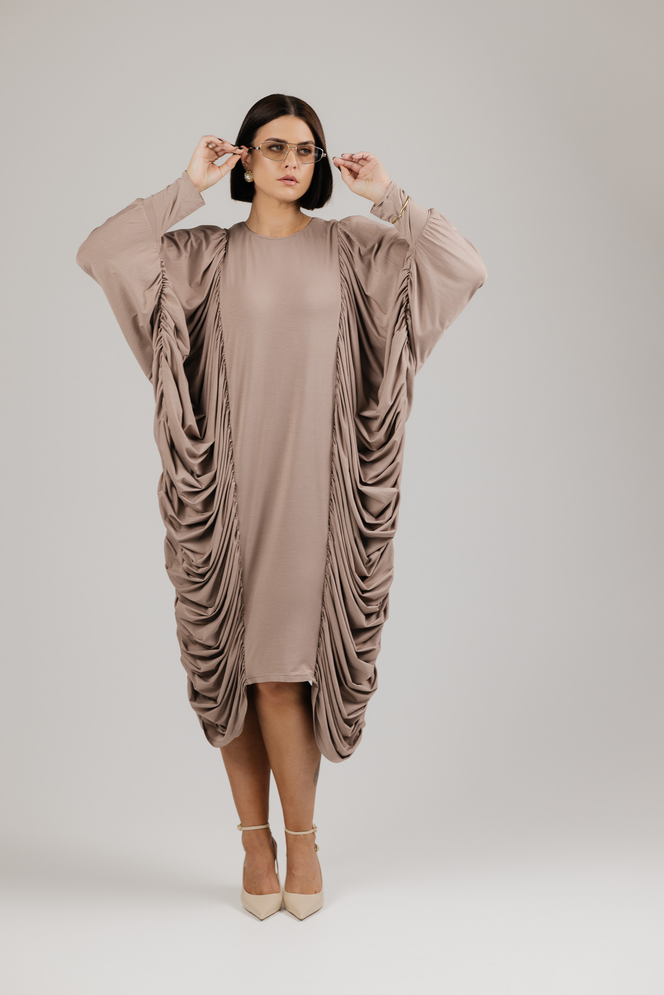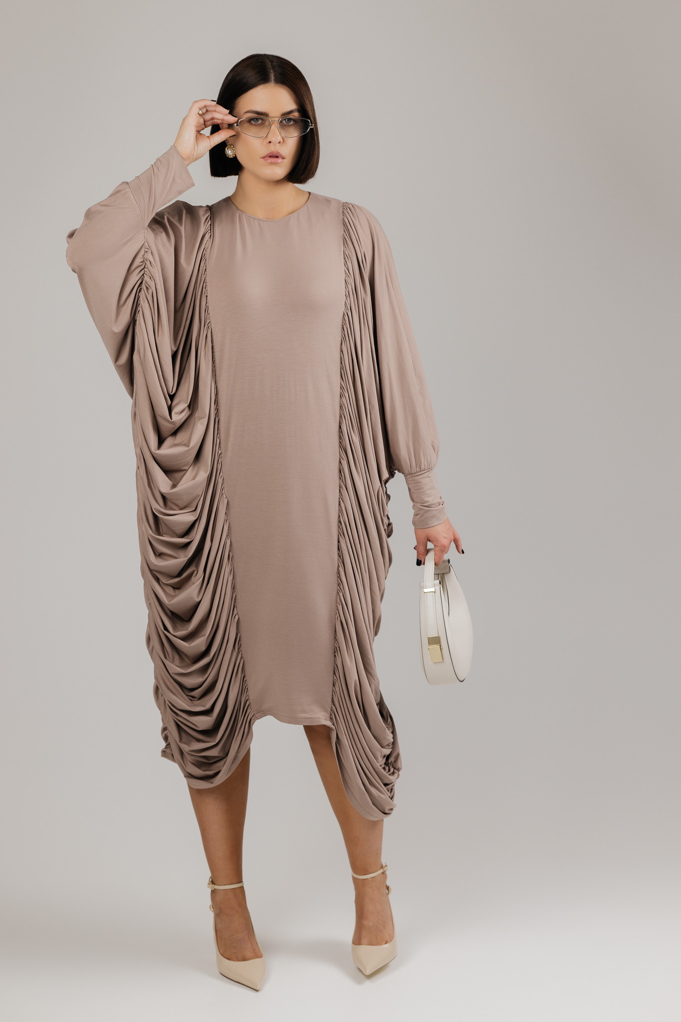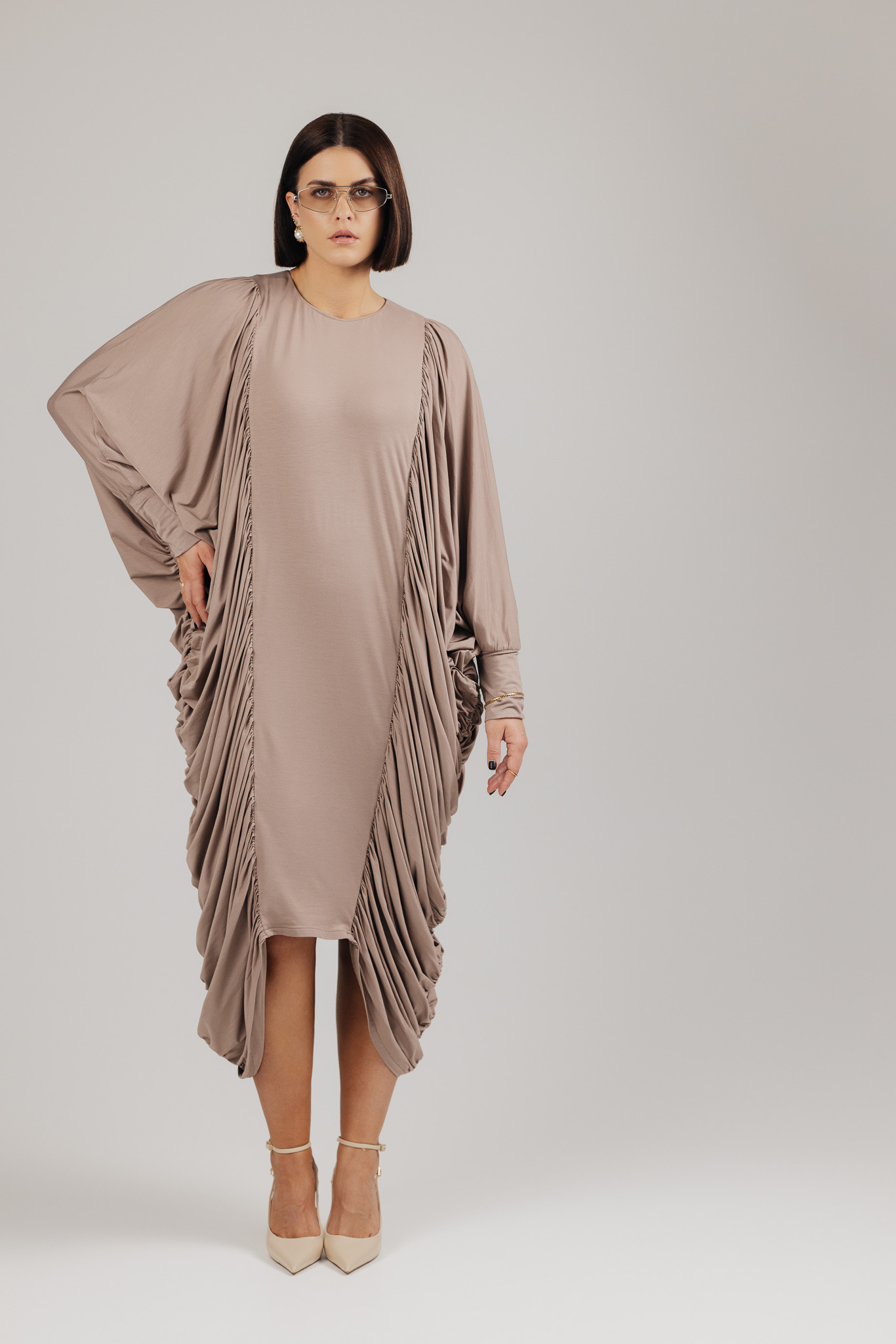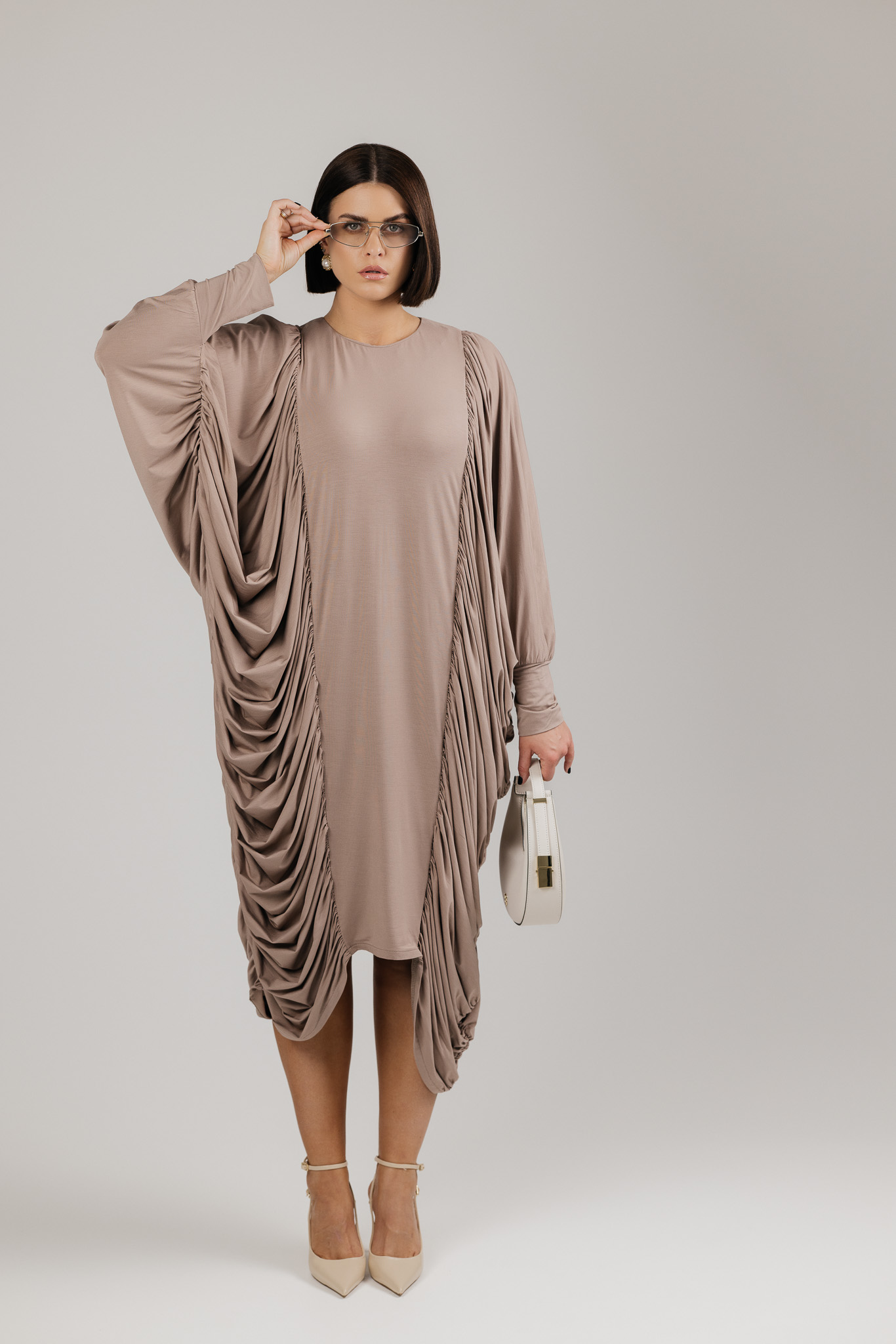 DRAPE suknelė sukurta iš medžiagos, kuri krenta laisvai ir natūraliai, formuodama minkštas, banguojančias klostes. Drapiruotos šoninės linijos sukuria skulptūrišką siluetą, o kiekvienas judesys suteikia suknelei gyvumo ir lengvumo.