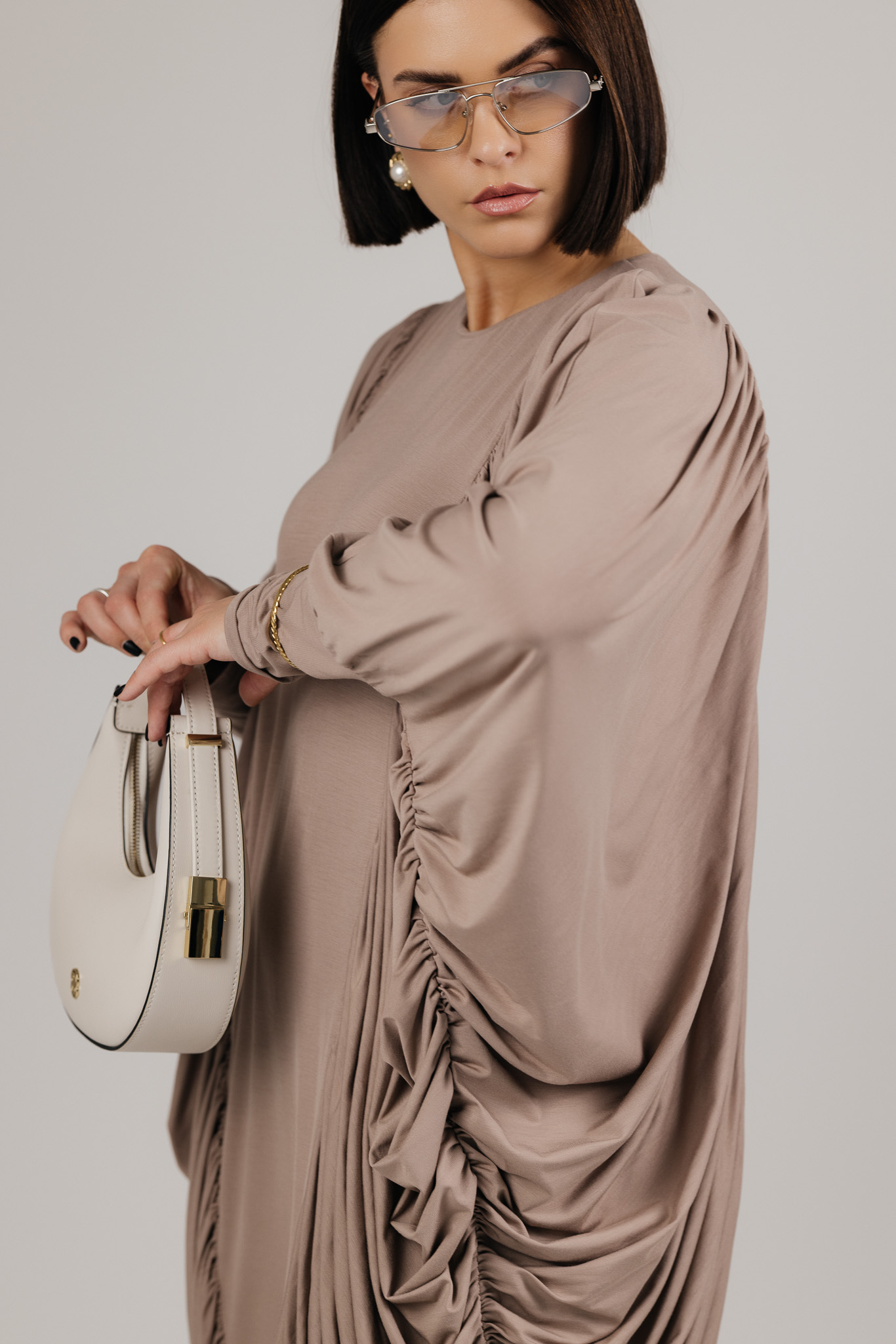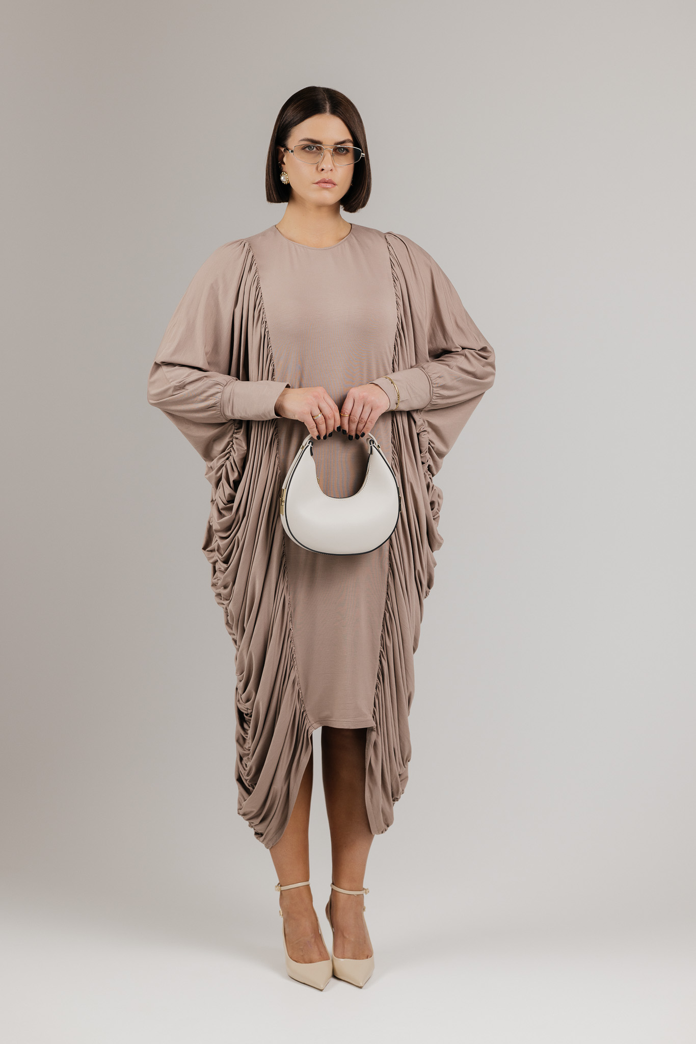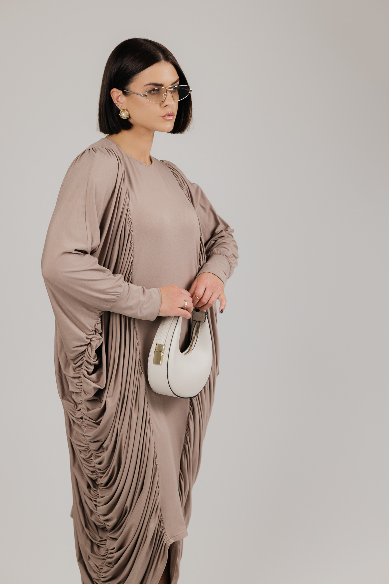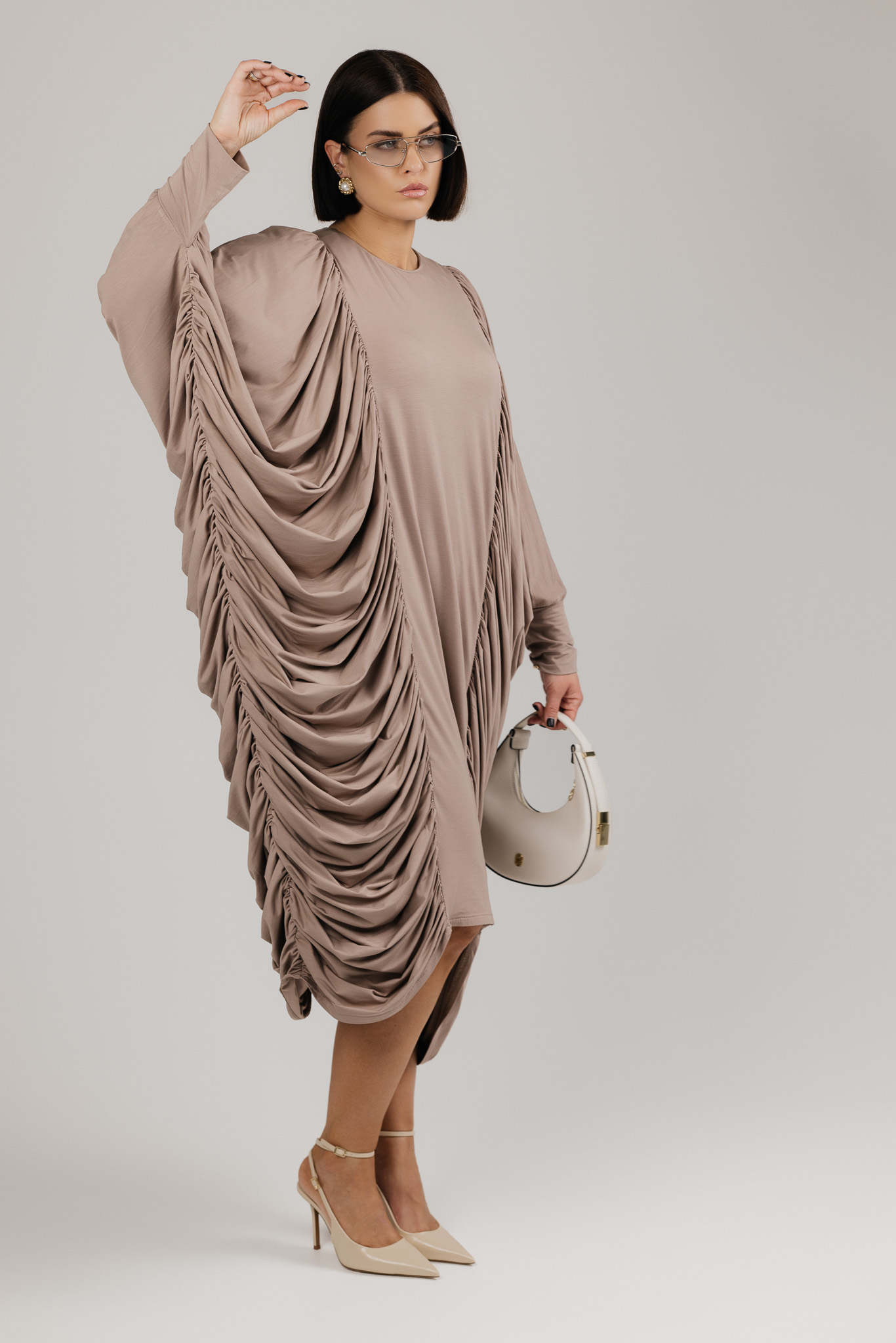 DRAPE suknelė sukurta iš medžiagos, kuri krenta laisvai ir natūraliai, formuodama minkštas, banguojančias klostes. Drapiruotos šoninės linijos sukuria skulptūrišką siluetą, o kiekvienas judesys suteikia suknelei gyvumo ir lengvumo.