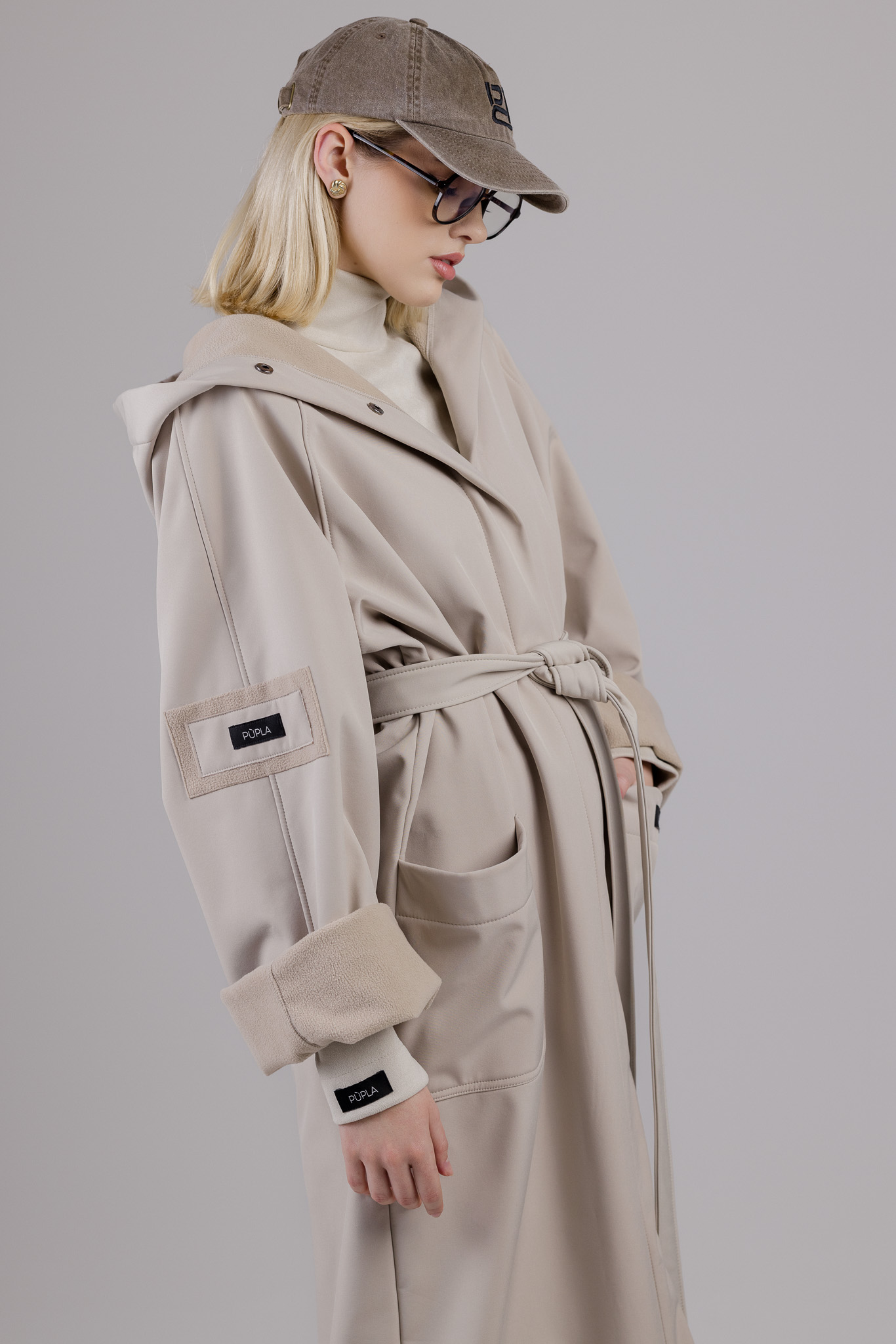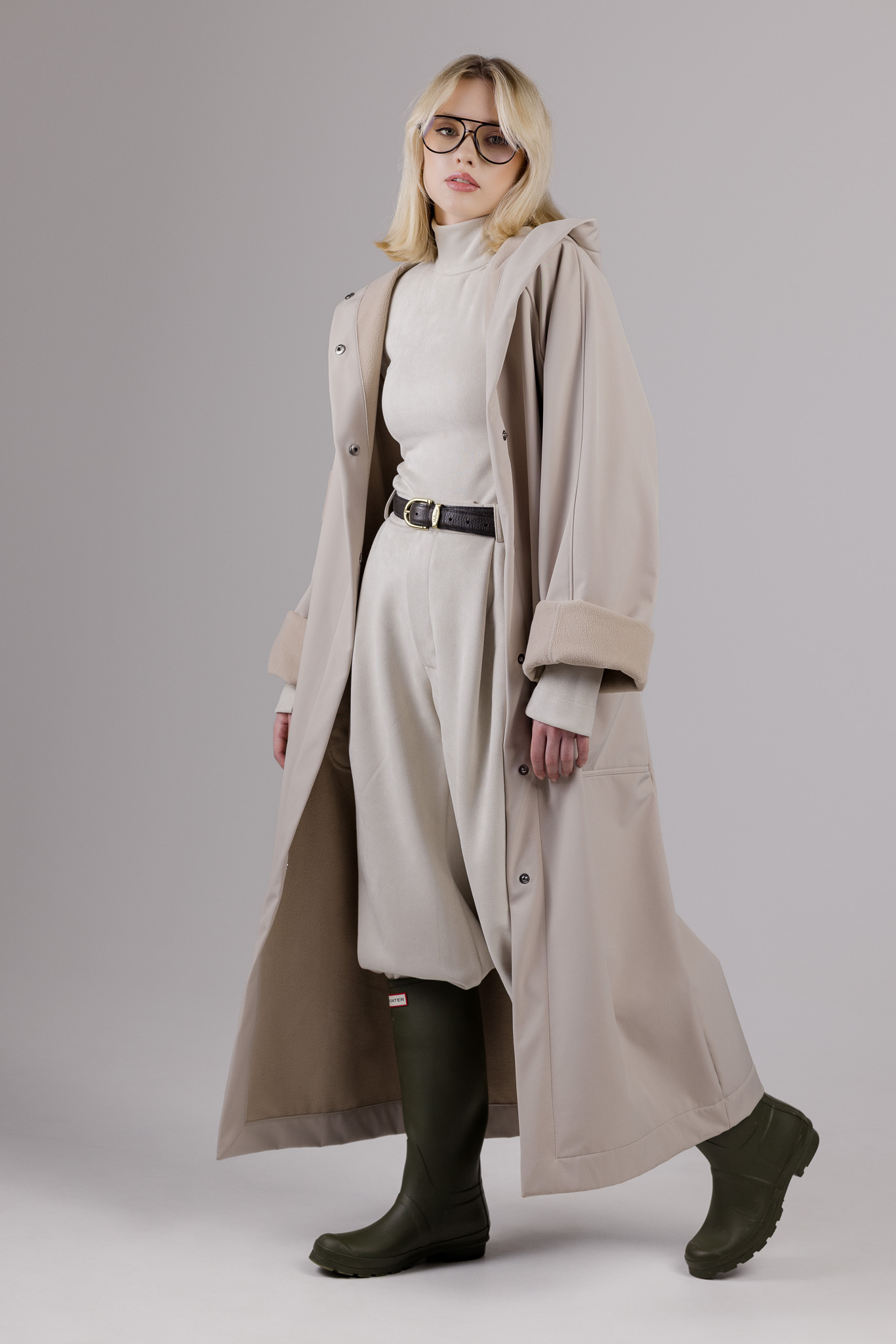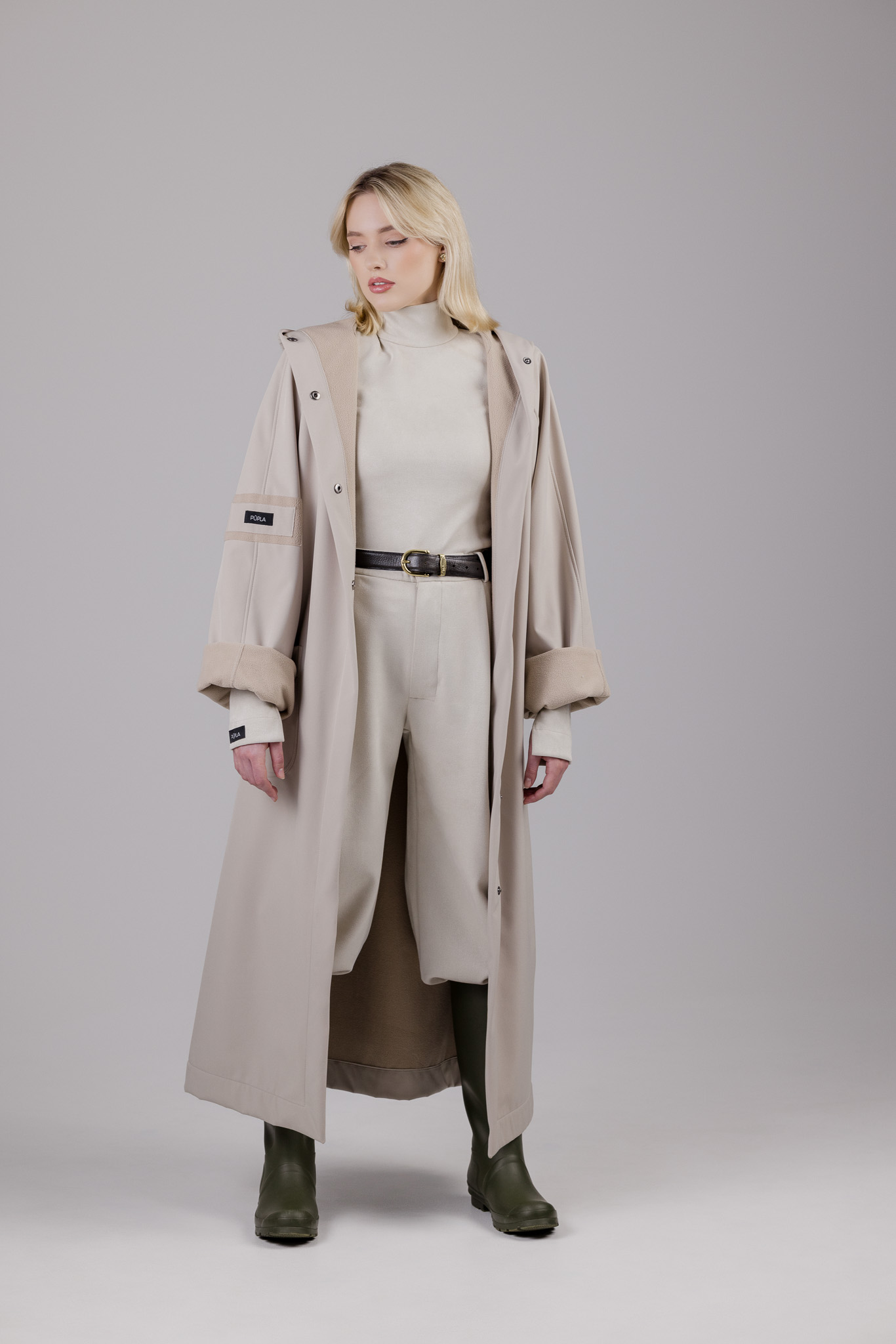 Ilgos rankovės, didelis kapišonas, šponkė aukščiausioje lietpalčio vietoje, kuri saugos kaklą nuo vėjo ir lietaus. Neperšlampanti, matinė medžiaga, vidinėje pusėje padengta flysu, kurio dėka lietpaltis nėra tarsi šaltas ir plastmasinis medžiagos gabalas.