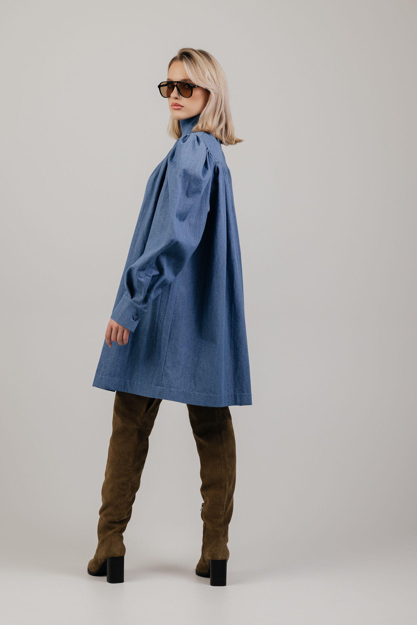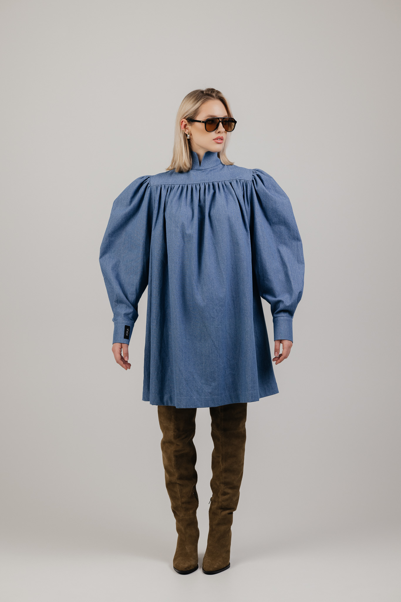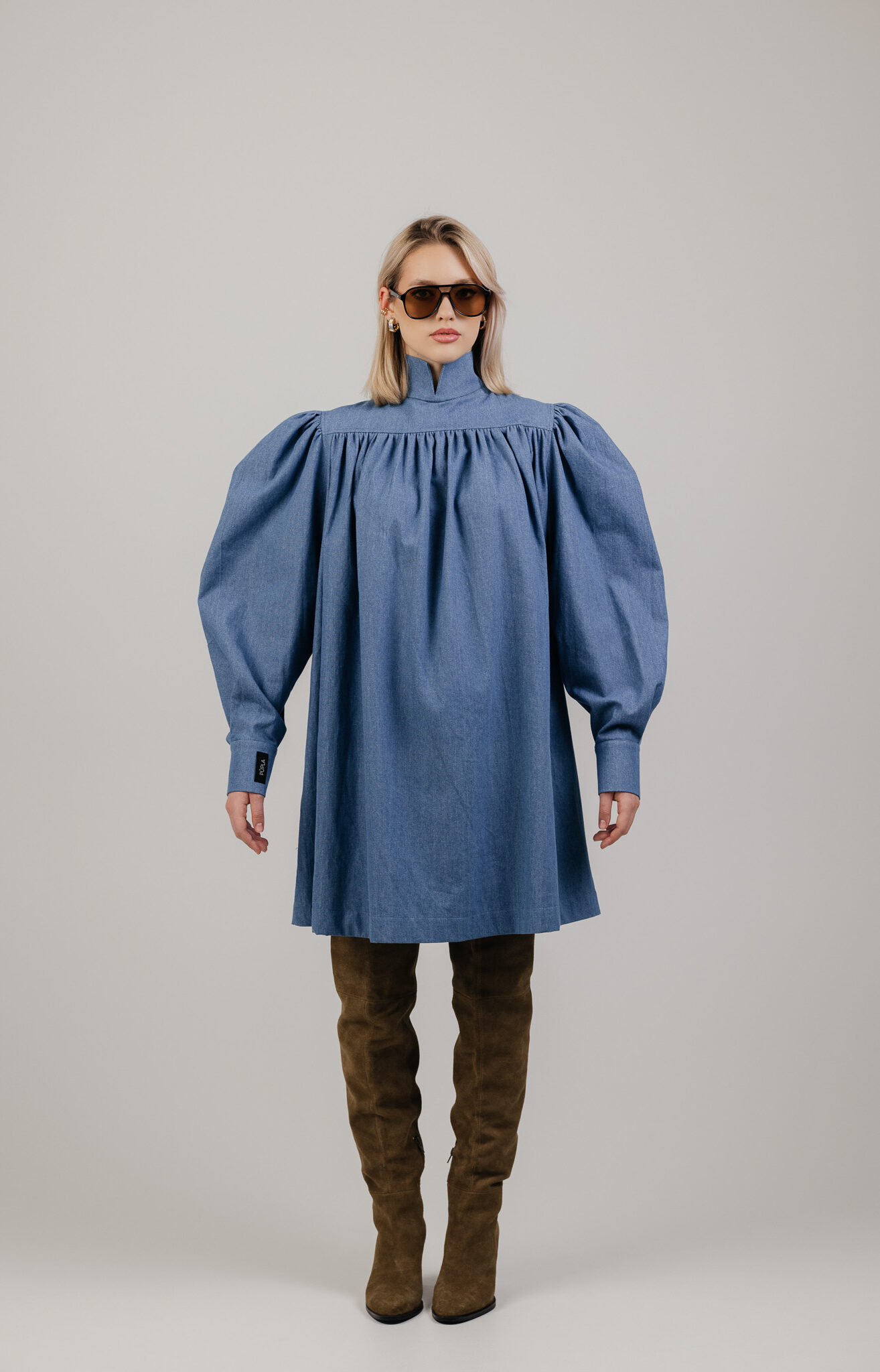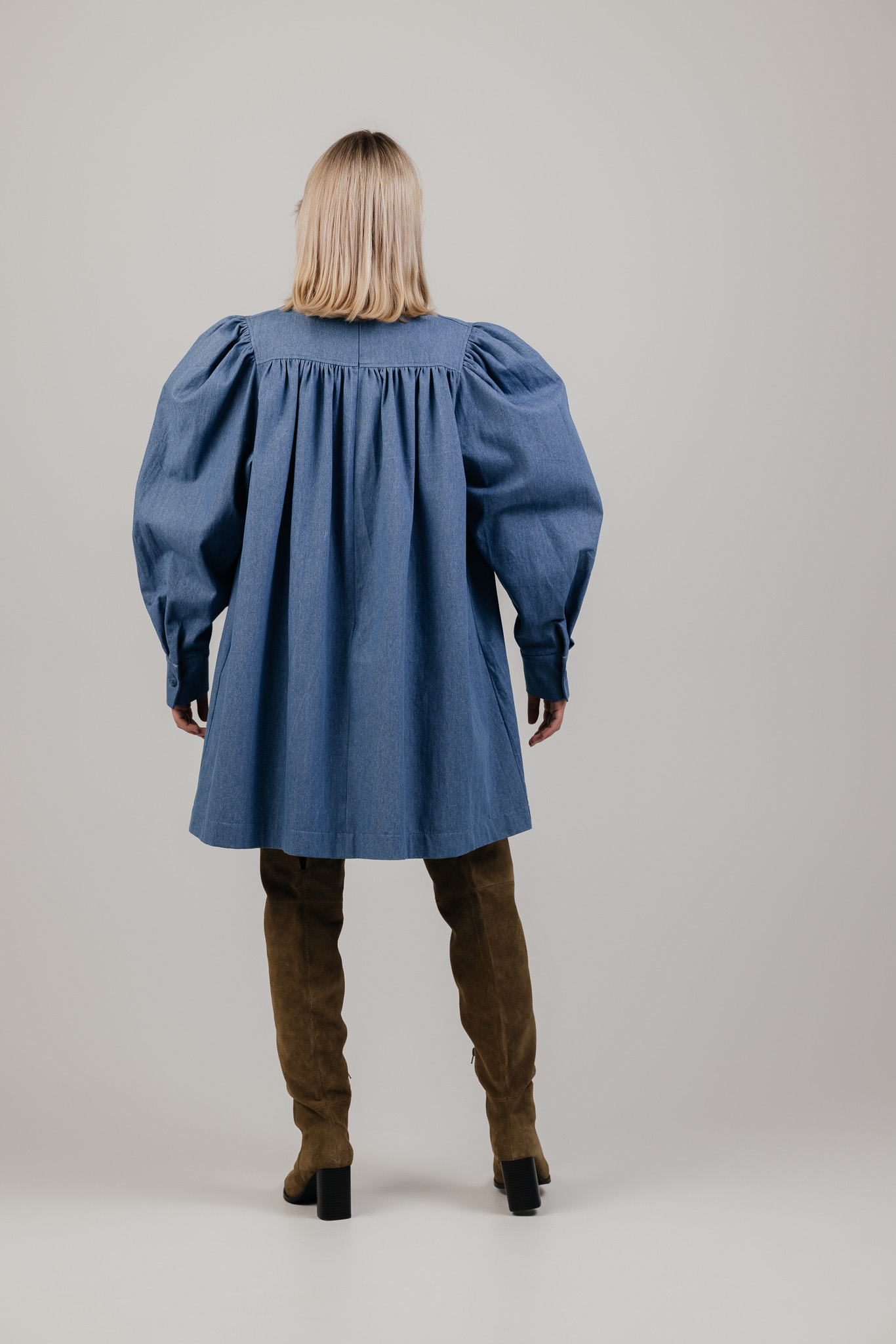 Platus, lengvai krentantis siluetas leidžia audiniui judėti kartu su kūnu, o švelniai pūsti pečiai ir rankovės suteikia formai išraiškos. Suknelė atrodo architektūriškai, tačiau išlieka patogi ir lengvai dėvima kasdien.