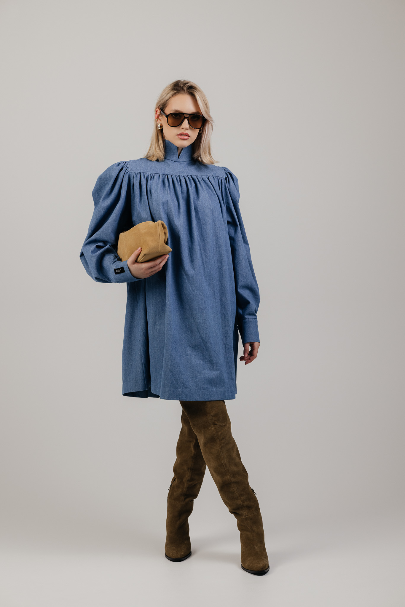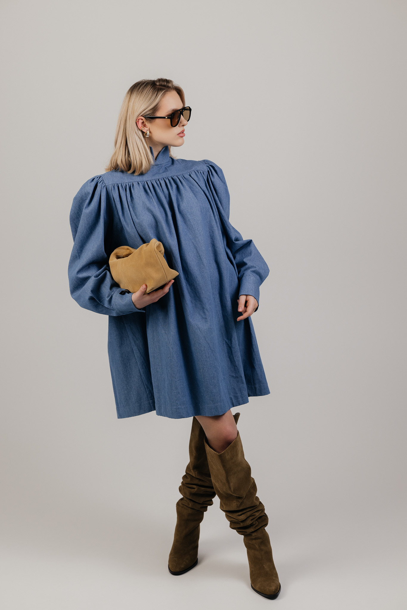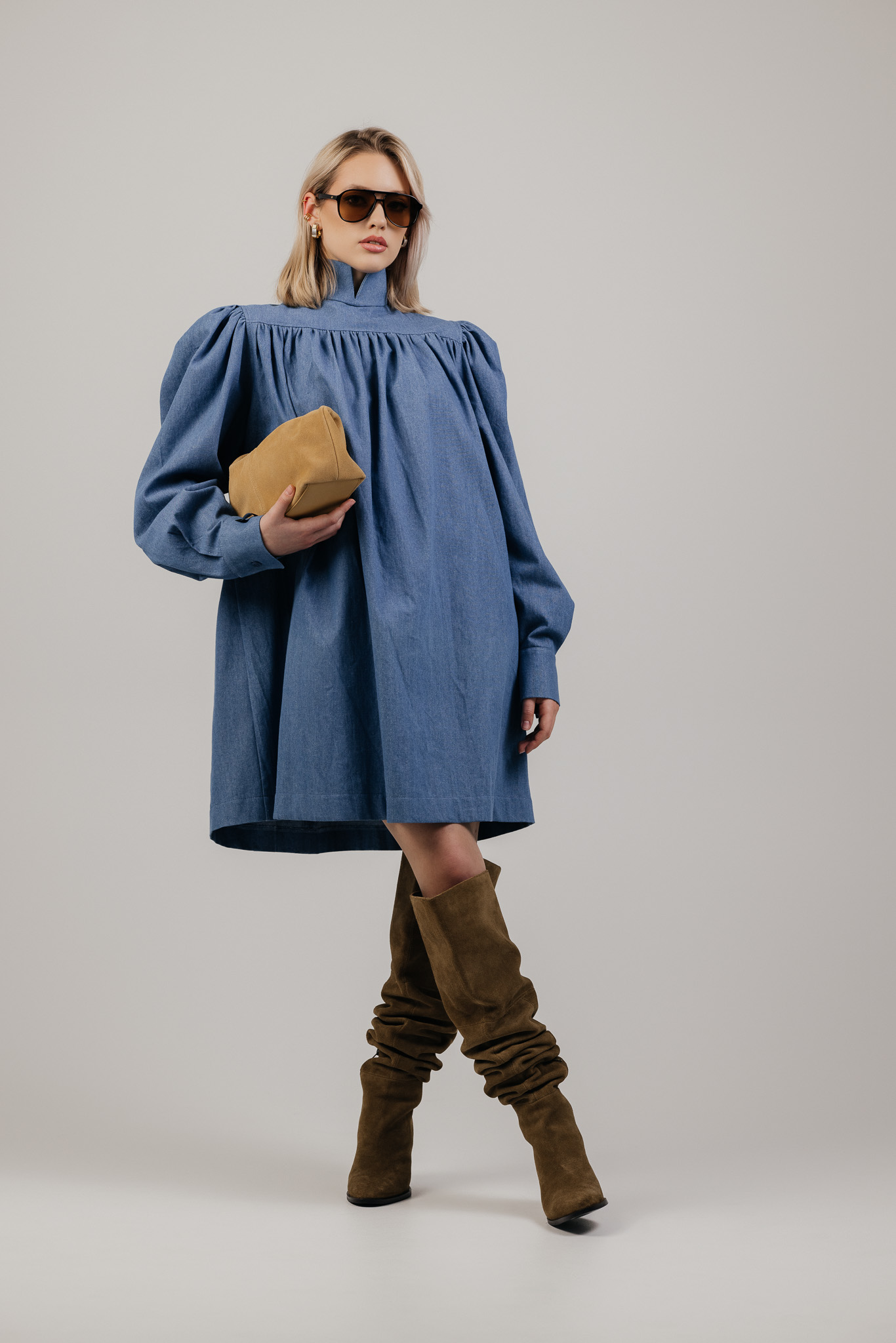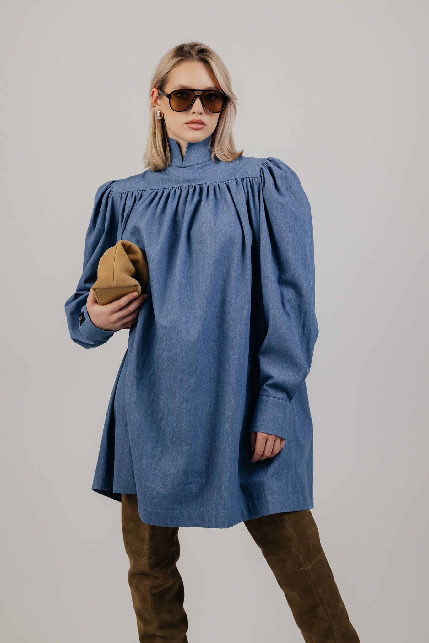 Platus, lengvai krentantis siluetas leidžia audiniui judėti kartu su kūnu, o švelniai pūsti pečiai ir rankovės suteikia formai išraiškos. Suknelė atrodo architektūriškai, tačiau išlieka patogi ir lengvai dėvima kasdien.