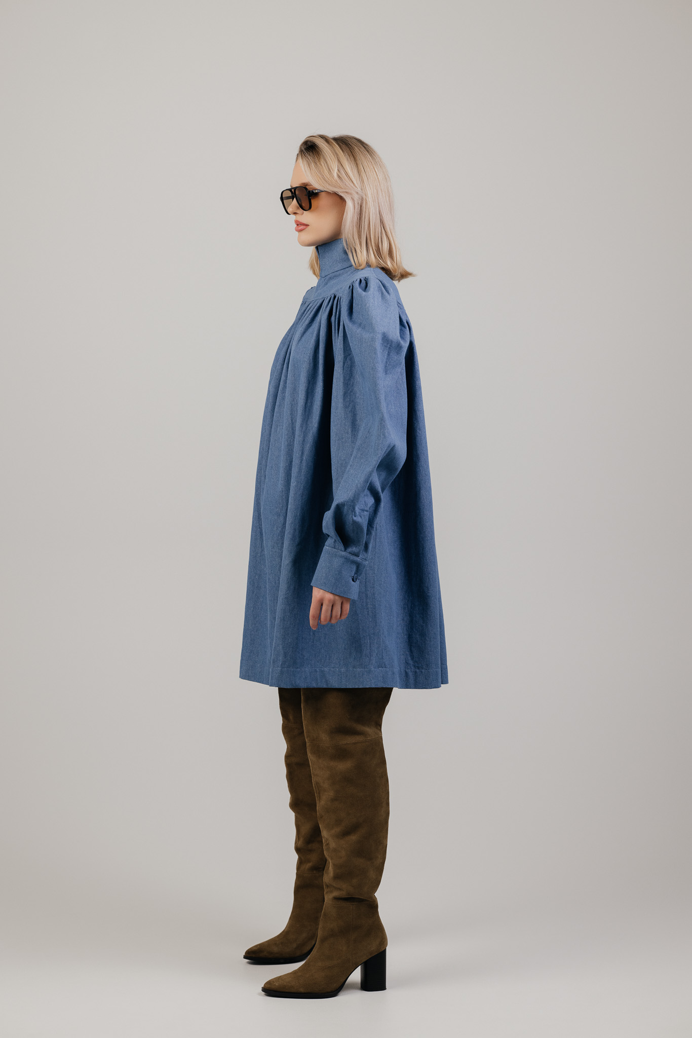Siluetas, kuris prasideda nuo kaklo. HALO suknelė išsiskiria aukšta, struktūriška apykakle, kuri subtiliai įrėmina veidą ir tampa pagrindiniu viso drabužio akcentu. Tai detalė, suteikianti suknelei charakterio ir ramios, modernios elegancijos.