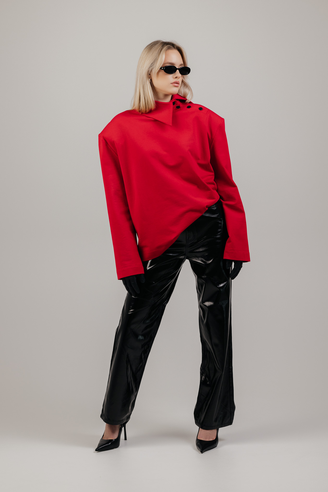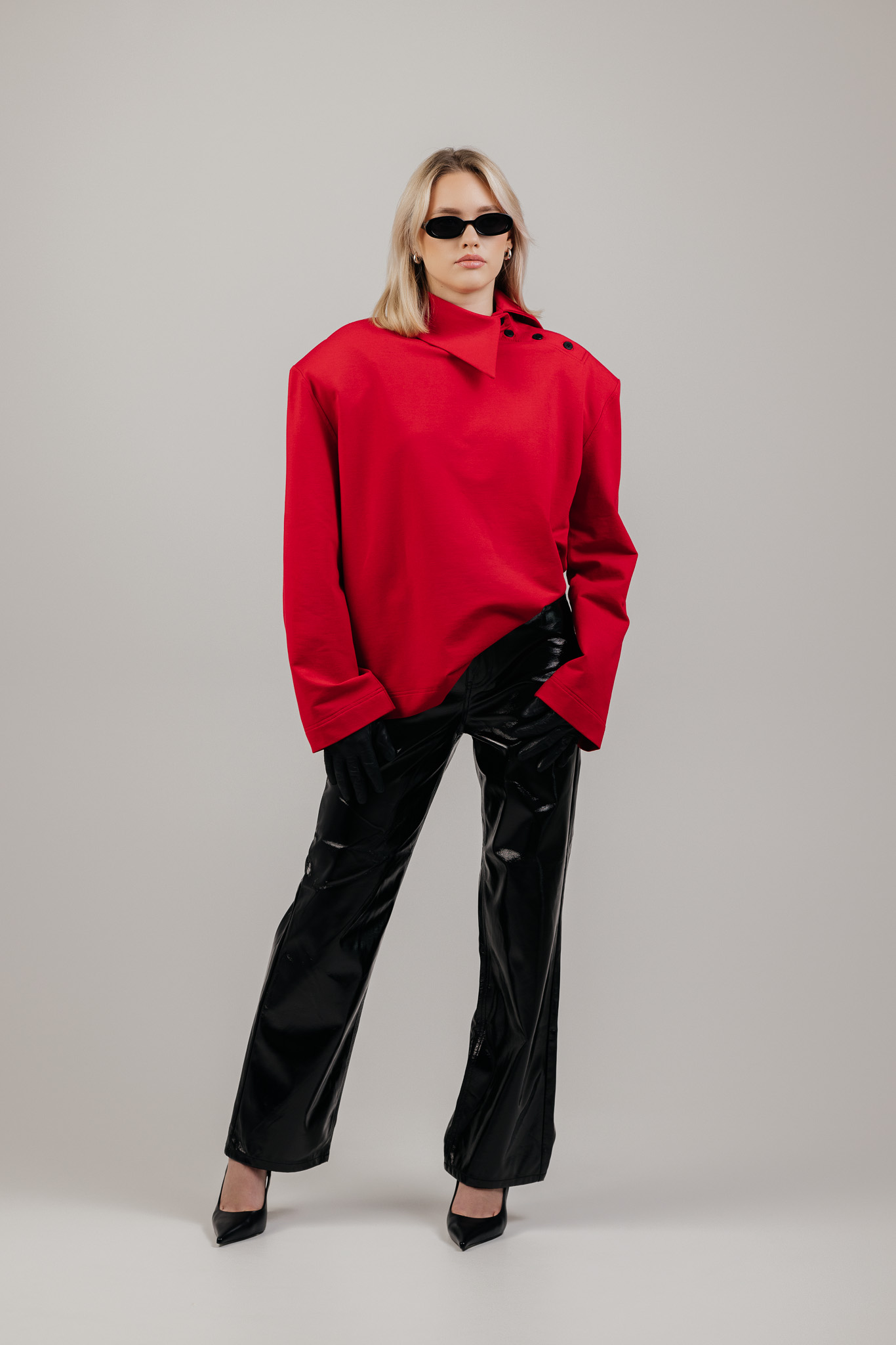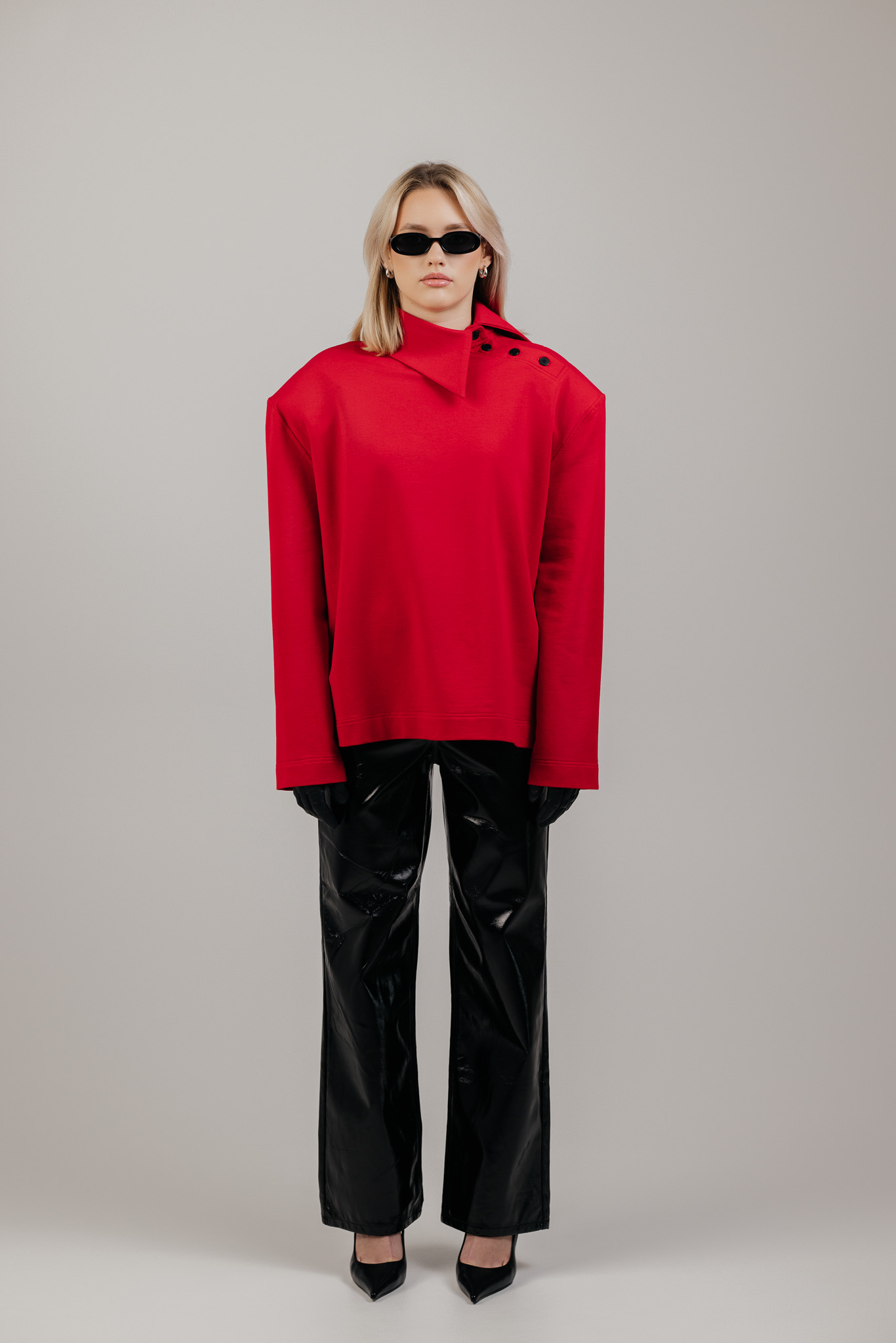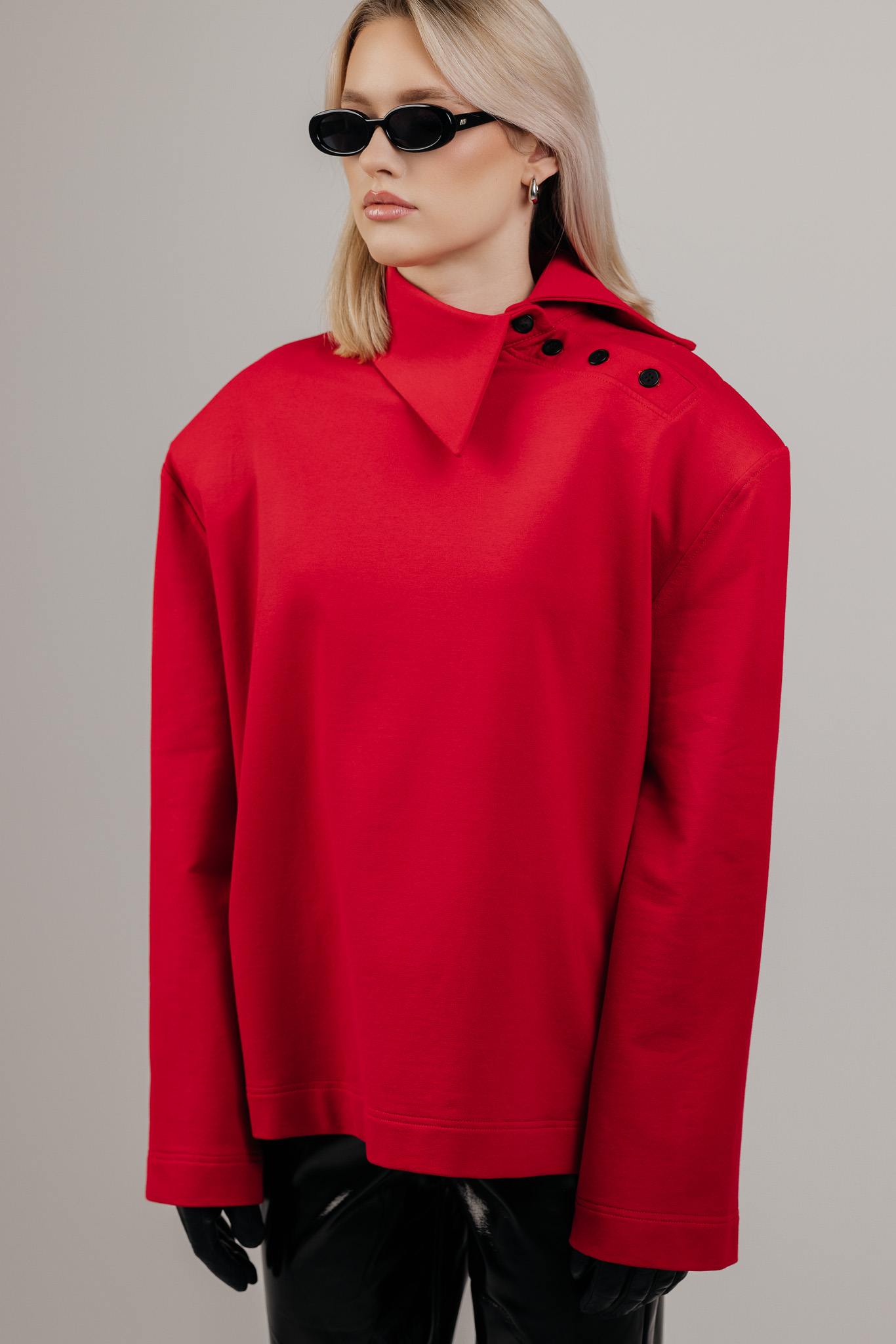 ATLAS džemperis sukurtas aplink aiškią formą – tvirtą pečių liniją, švarią silueto geometriją ir išskirtinę apykaklę, kuri tampa pagrindiniu šio drabužio akcentu. Ji subtiliai įrėmina veidą ir suteikia visam įvaizdžiui charakterio.