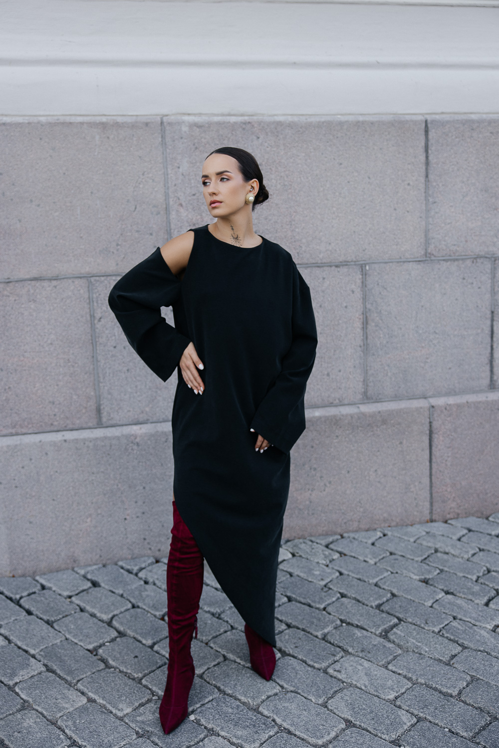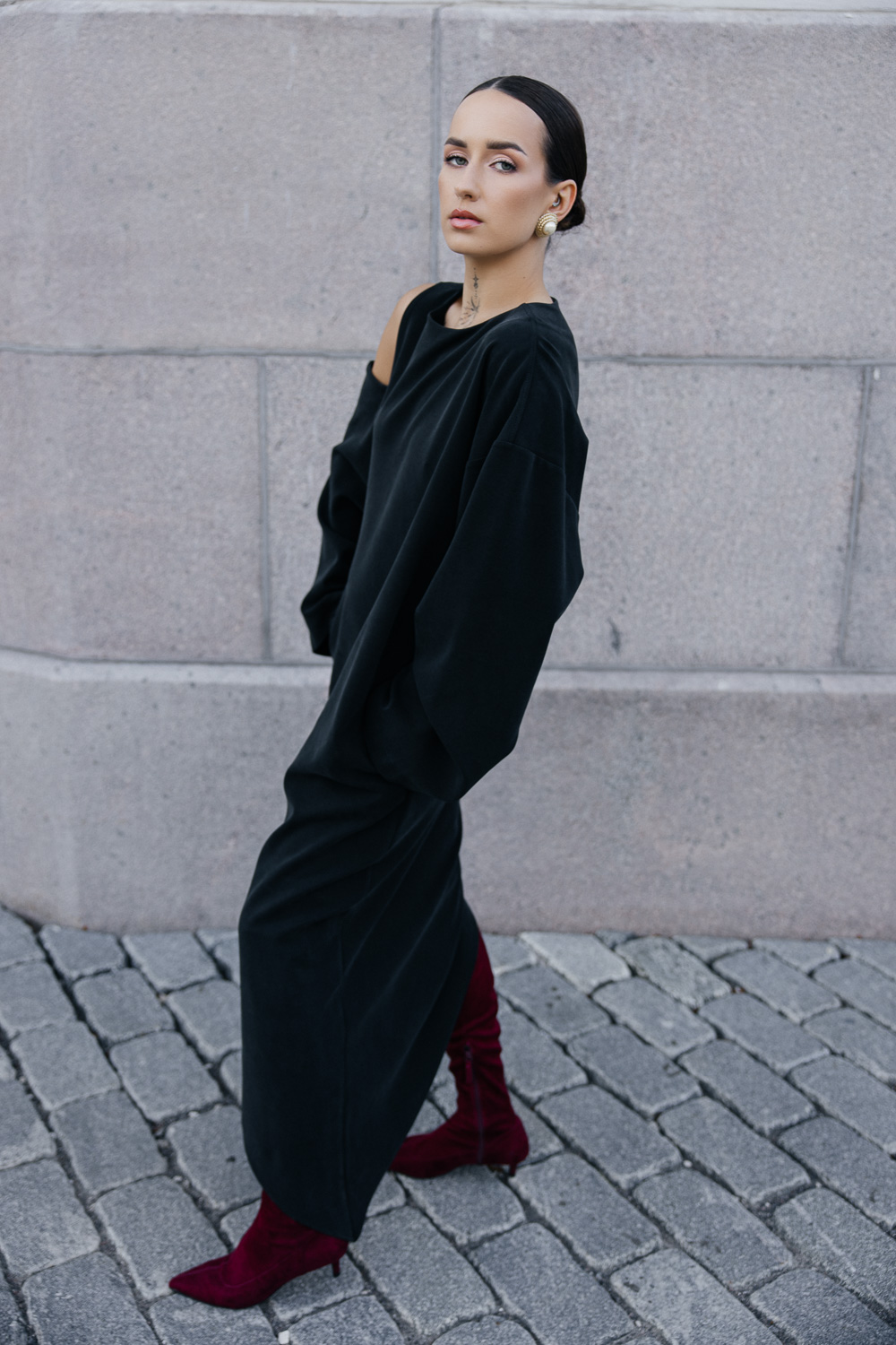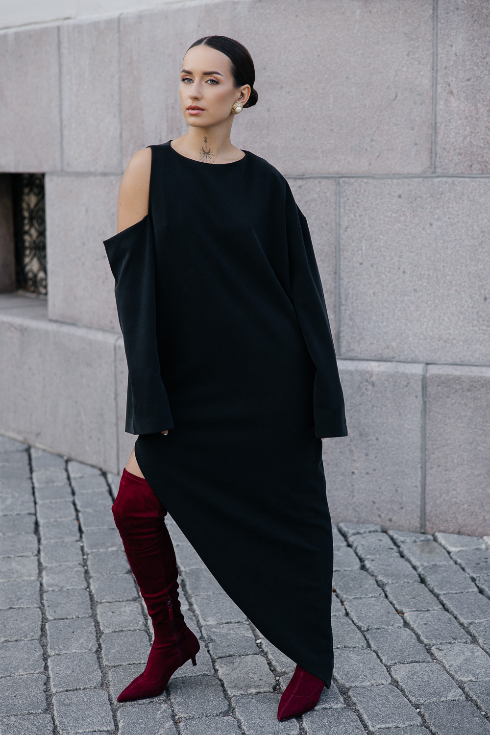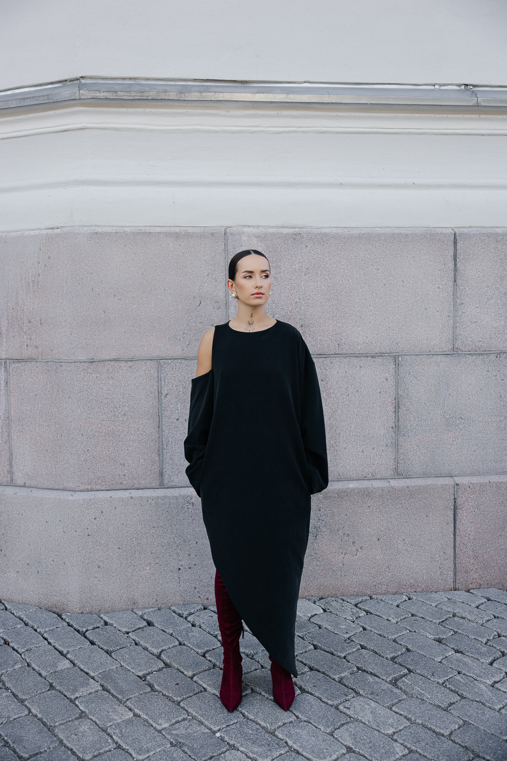 Ši suknelė labai įdomi savo kontrastais: laisvas, tarsi tekantis siluetas, bet kartu aštrus asimetriškas kraštas. Atviri pečiai, kurie suteikia pažeidžiamumo ir gili juoda spalva, kuri kuria jėgą bei paslaptį. Ji atrodo kaip judantis šešėlis – turintis ir dramatiškumo, ir subtilios elegancijos.