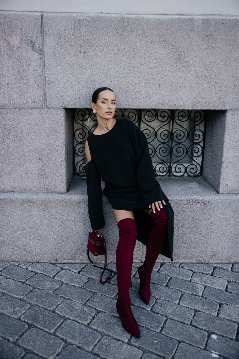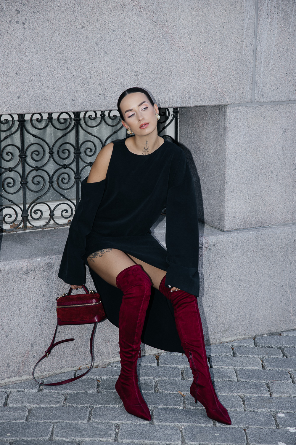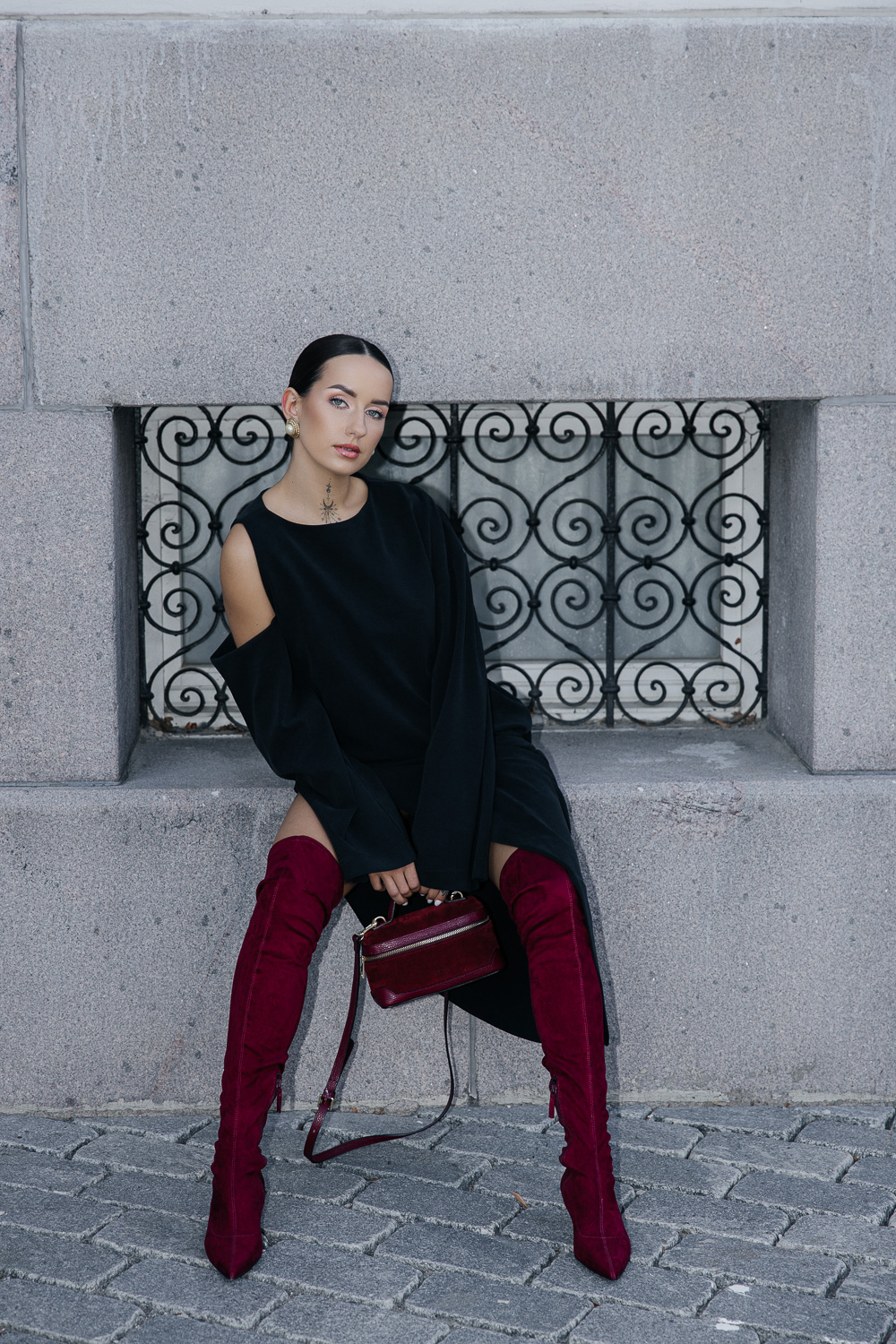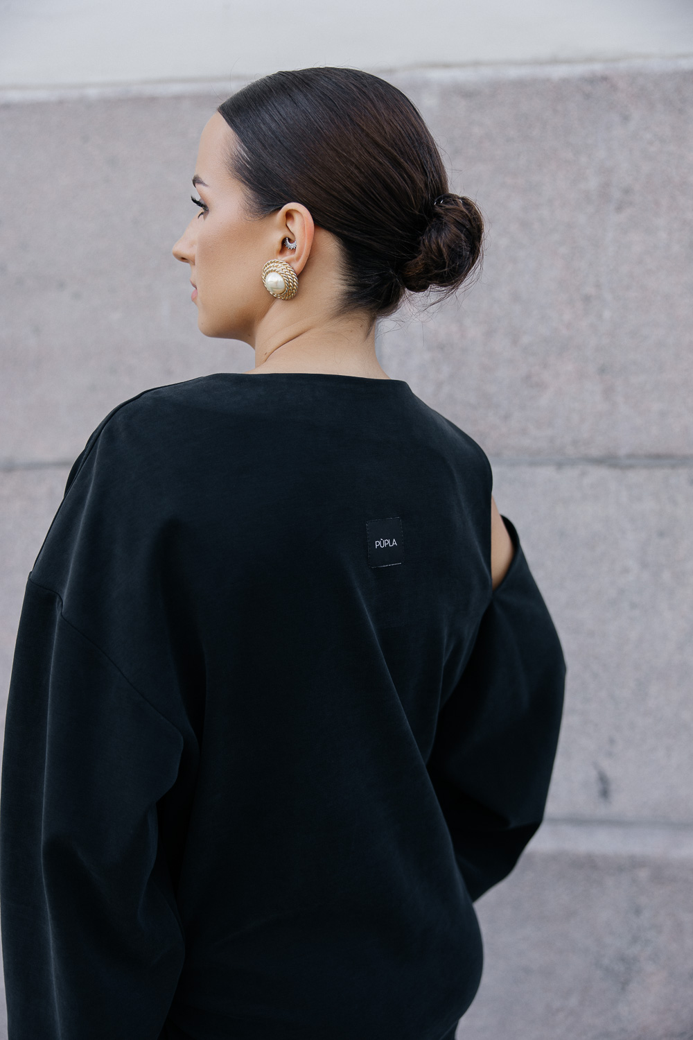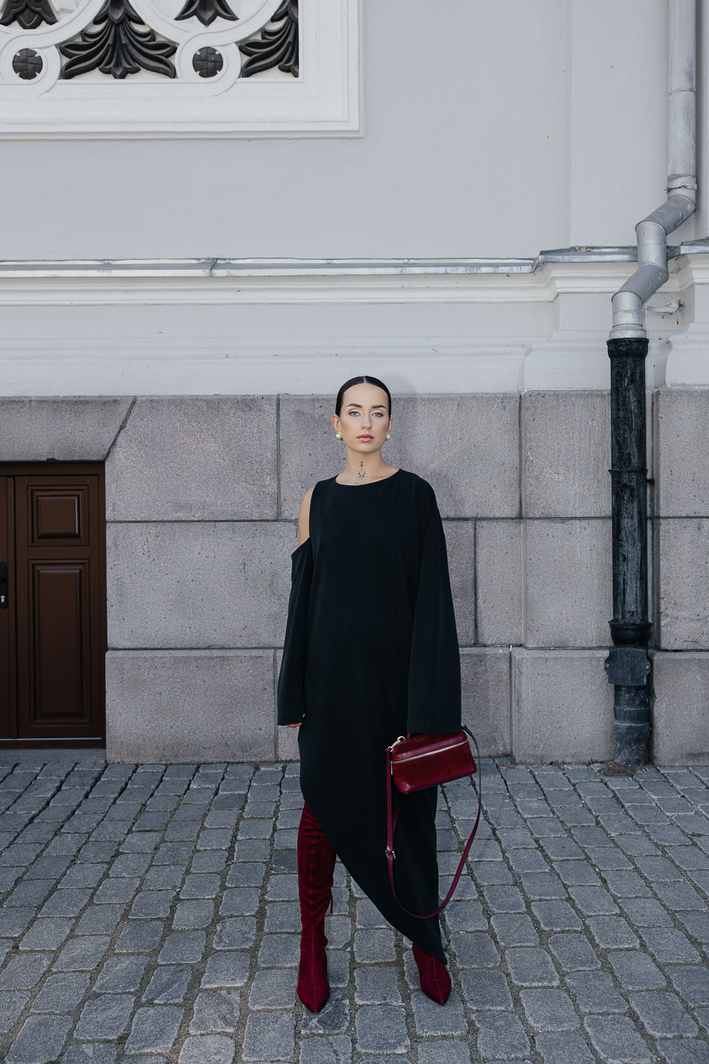 Ši suknelė labai įdomi savo kontrastais: laisvas, tarsi tekantis siluetas, bet kartu aštrus asimetriškas kraštas. Atviri pečiai, kurie suteikia pažeidžiamumo ir gili juoda spalva, kuri kuria jėgą bei paslaptį. Ji atrodo kaip judantis šešėlis – turintis ir dramatiškumo, ir subtilios elegancijos.