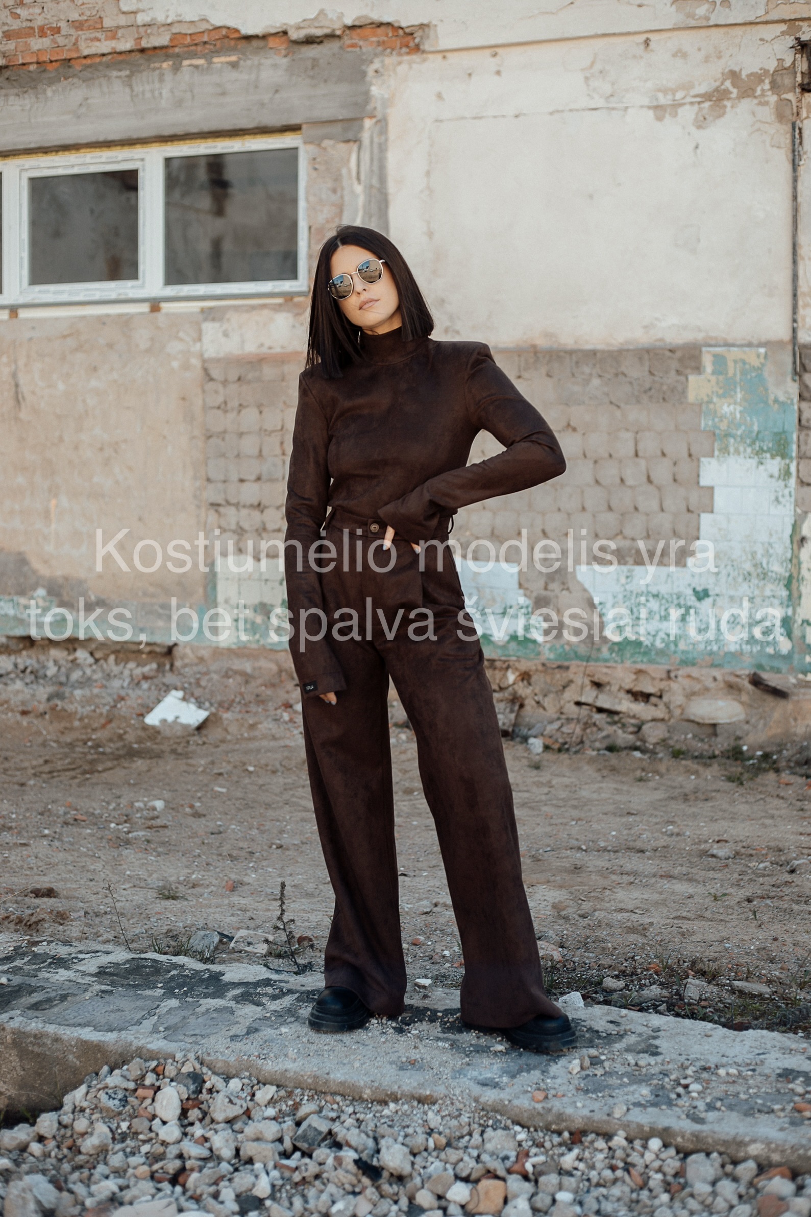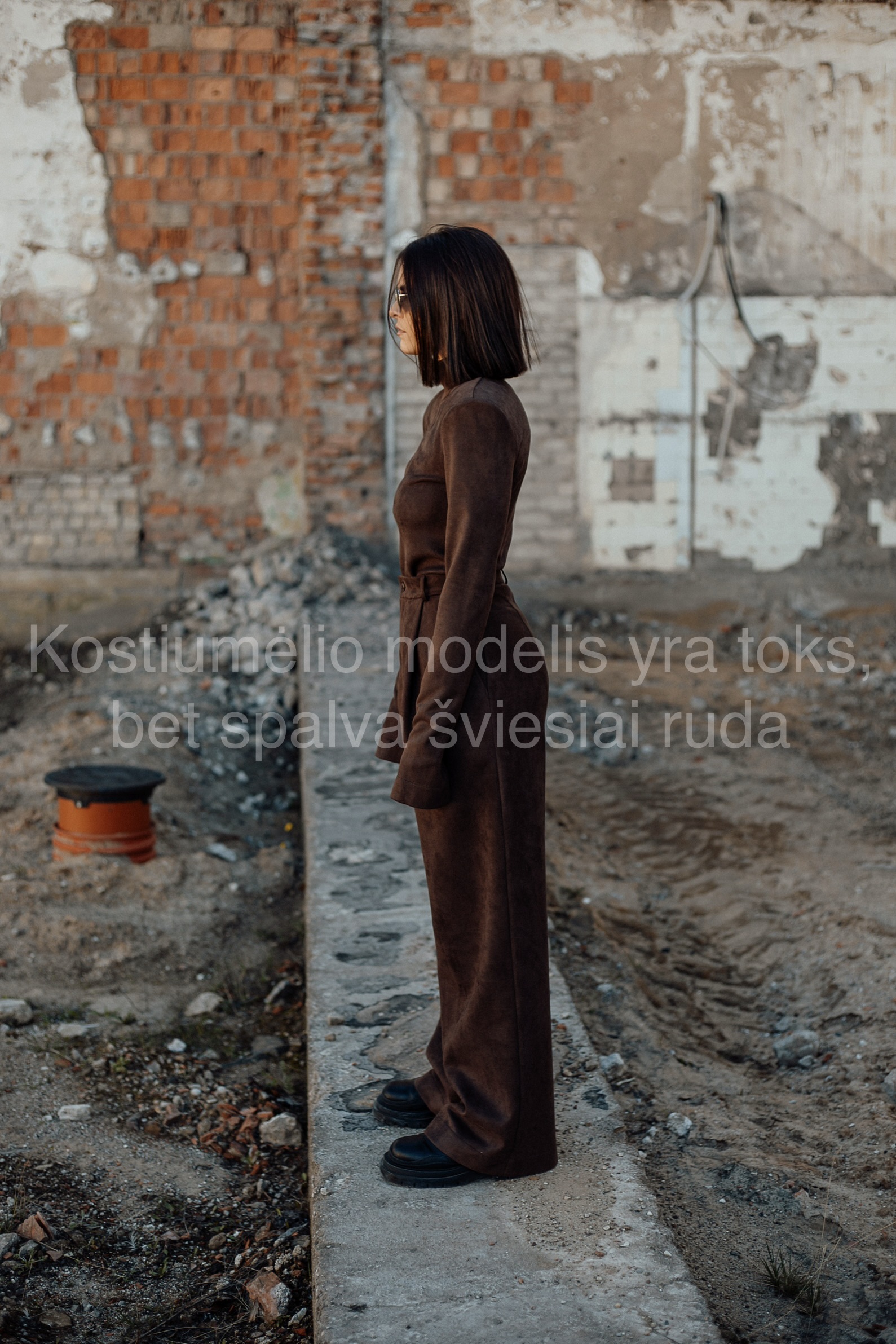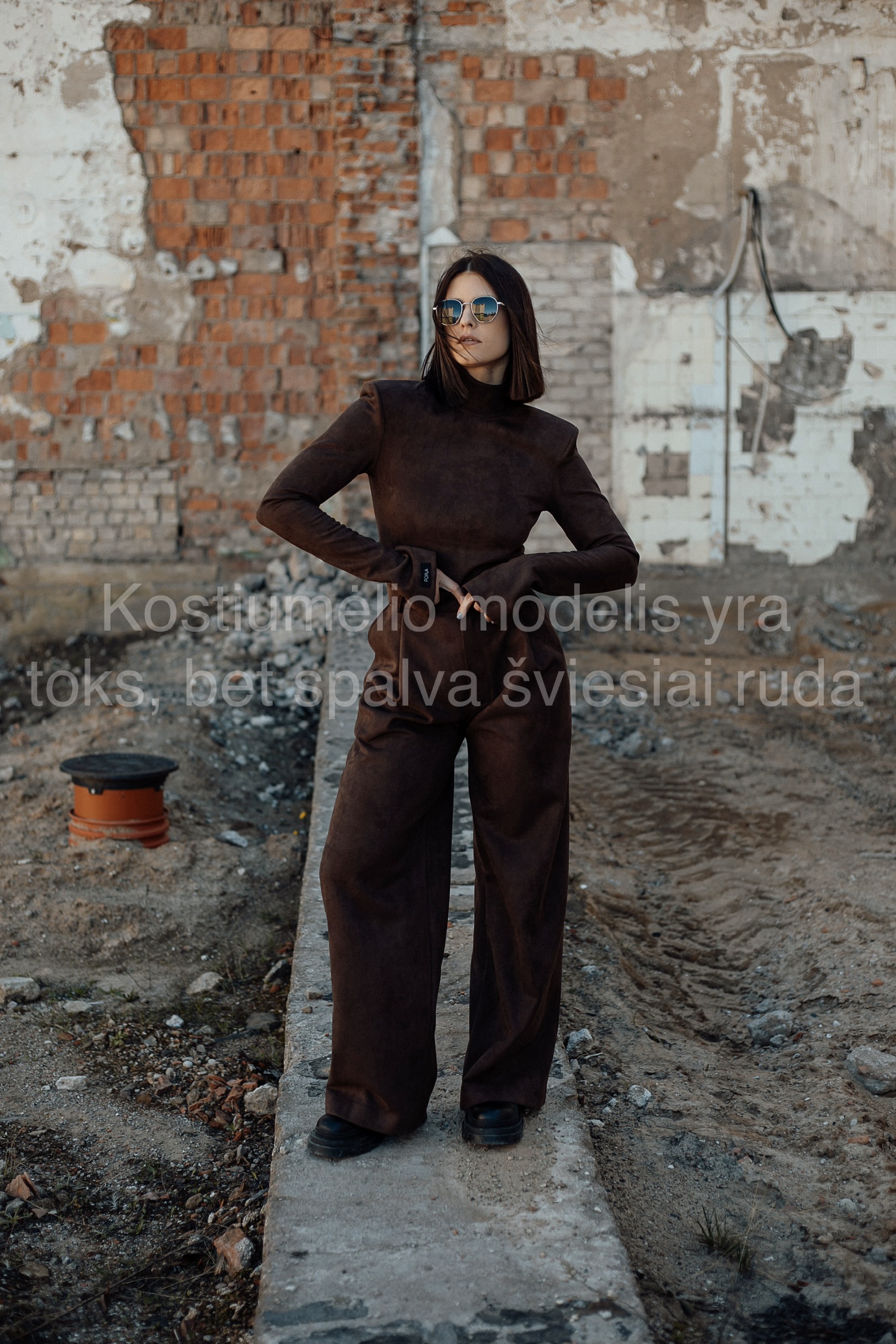 Kartu jie sukuria kostiumėlį, kuris alsuoja pasitikėjimu. Dramatiški pečiai subalansuoja plačias kelnes, o laisvas kritimas suteikia judesio ir lengvumo. Tai derinys moteriai, kuri nori būti matoma – ne dėl triukšmo, o dėl laikysenos.